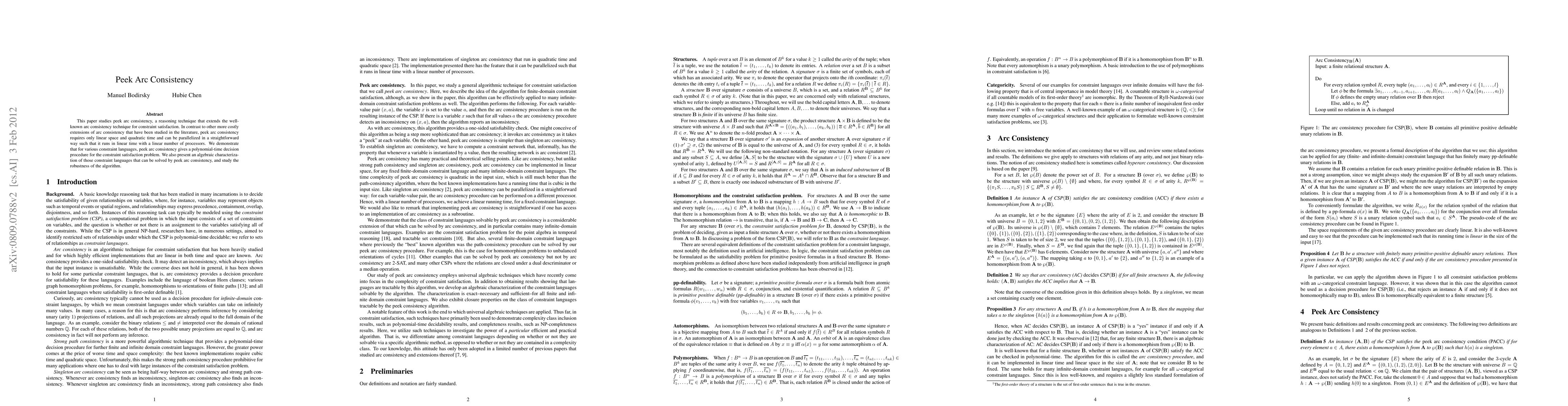 This paper introduces peek arc consistency, an efficient extension of arc consistency for constraint satisfaction that requires linear space and quadratic time, and can be parallelized to run in linear time. It provides a polynomial-time decision procedure for various constraint languages and characterizes the languages solvable by this method.