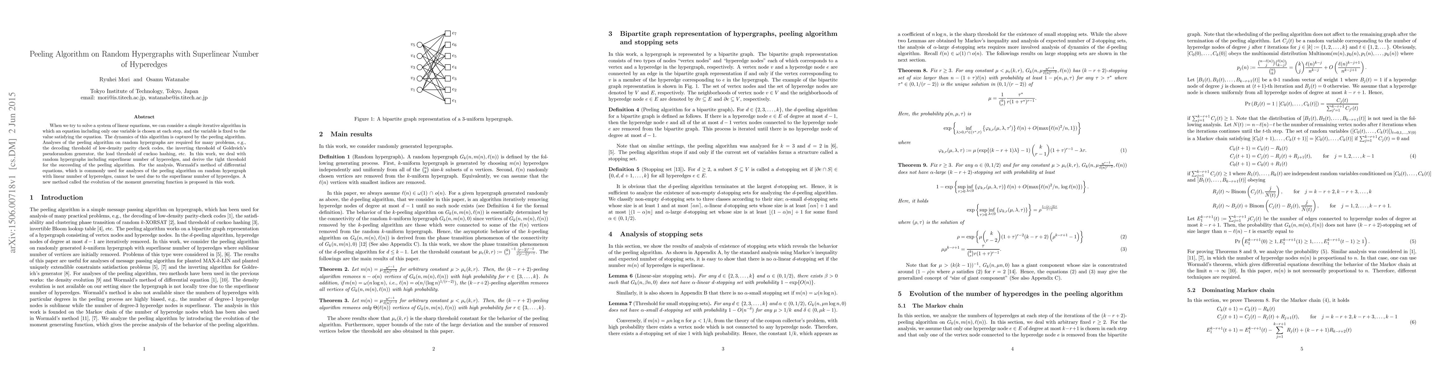 When we try to solve a system of linear equations, we can consider a simple iterative algorithm in which an equation including only one variable is chosen at each step, and the variable is fixed to the value satisfying the equation. The dynamics of this algorithm is captured by the peeling algorithm. Analyses of the peeling algorithm on random hypergraphs are required for many problems, e.g., the decoding threshold of low-density parity check codes, the inverting threshold of Goldreich's pseudorandom generator, the load threshold of cuckoo hashing, etc. In this work, we deal with random hypergraphs including superlinear number of hyperedges, and derive the tight threshold for the succeeding of the peeling algorithm. For the analysis, Wormald's method of differential equations, which is commonly used for analyses of the peeling algorithm on random hypergraph with linear number of hyperedges, cannot be used due to the superlinear number of hyperedges. A new method called the evolution of the moment generating function is proposed in this work.