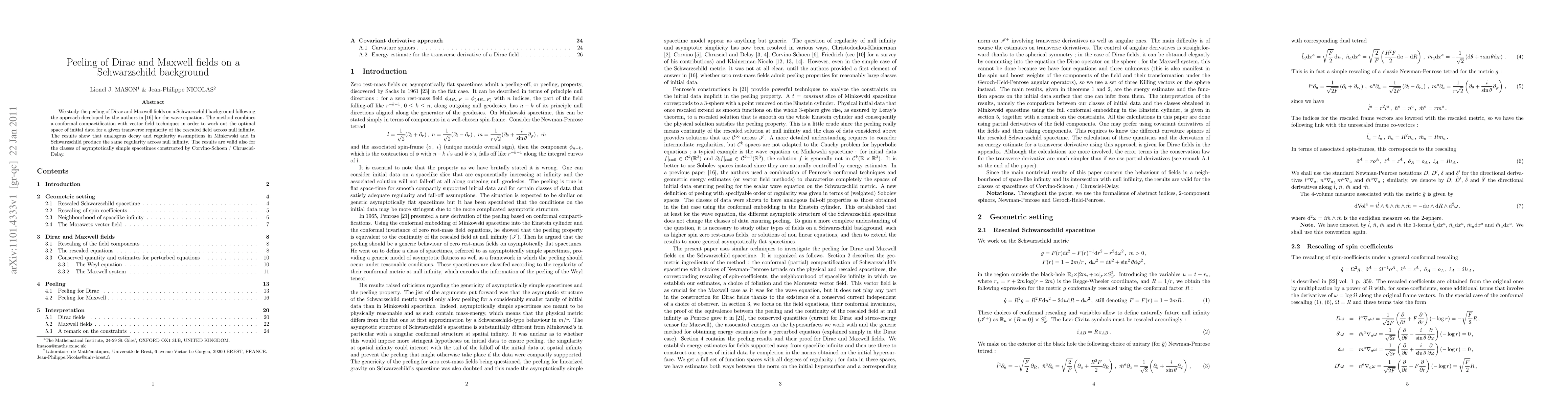 We study the peeling of Dirac and Maxwell fields on a Schwarzschild background following the approach developed by the authors in Mason-Nicolas 2009 for the wave equation. The method combines a conformal compactification with vector field techniques in order to work out the optimal space of initial data for a given transverse regularity of the rescaled field across null infinity. The results show that analogous decay and regularity assumptions in Minkowski and in Schwarzschild produce the same regularity across null infinity. The results are valid also for the classes of asymptotically simple spacetimes constructed by Corvino-Schoen / Chrusciel-Delay.