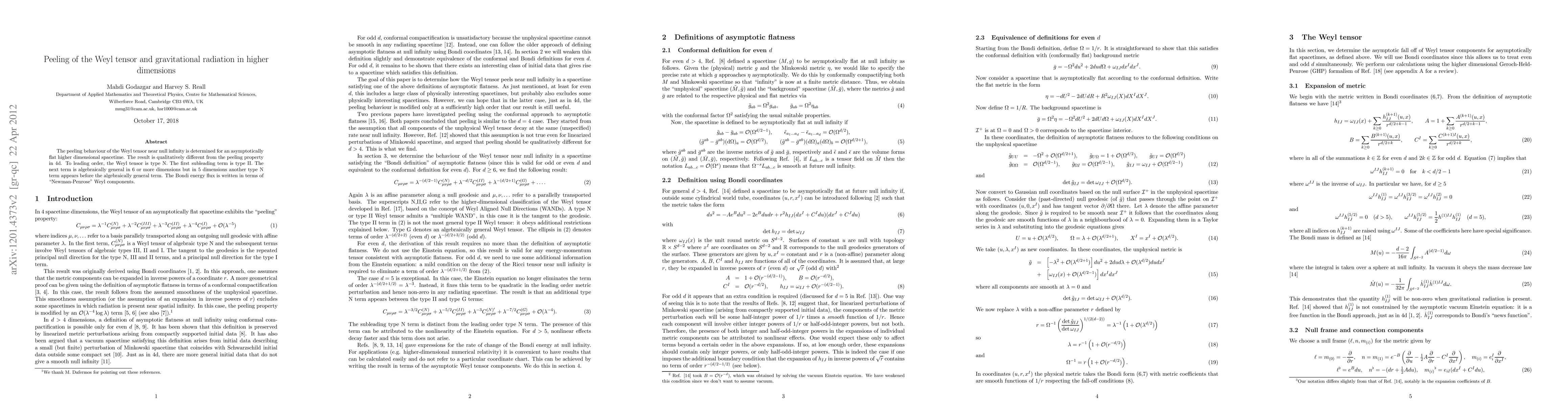 This paper investigates the peeling behavior of the Weyl tensor in higher-dimensional asymptotically flat spacetimes, finding it qualitatively different from 4D. The leading term is type N, followed by type II, with a complex pattern in 6+ dimensions and an additional type N term in 5D before the algebraically general term.
