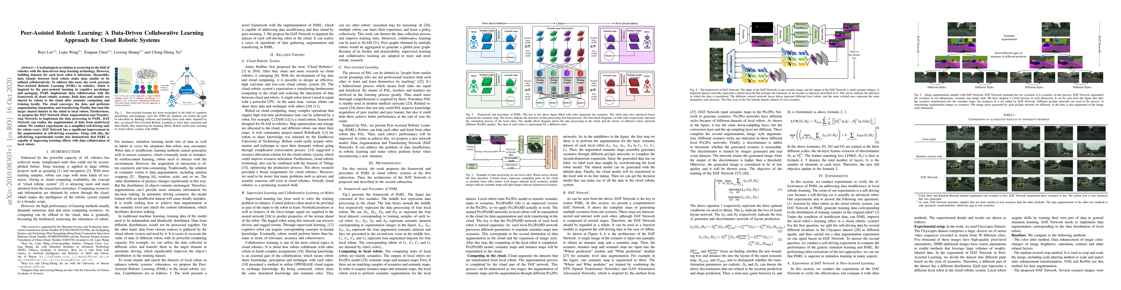 A technological revolution is occurring in the field of robotics with the data-driven deep learning technology. However, building datasets for each local robot is laborious. Meanwhile, data islands between local robots make data unable to be utilized collaboratively. To address this issue, the work presents Peer-Assisted Robotic Learning (PARL) in robotics, which is inspired by the peer-assisted learning in cognitive psychology and pedagogy. PARL implements data collaboration with the framework of cloud robotic systems. Both data and models are shared by robots to the cloud after semantic computing and training locally. The cloud converges the data and performs augmentation, integration, and transferring. Finally, fine tune this larger shared dataset in the cloud to local robots. Furthermore, we propose the DAT Network (Data Augmentation and Transferring Network) to implement the data processing in PARL. DAT Network can realize the augmentation of data from multi-local robots. We conduct experiments on a simplified self-driving task for robots (cars). DAT Network has a significant improvement in the augmentation in self-driving scenarios. Along with this, the self-driving experimental results also demonstrate that PARL is capable of improving learning effects with data collaboration of local robots.