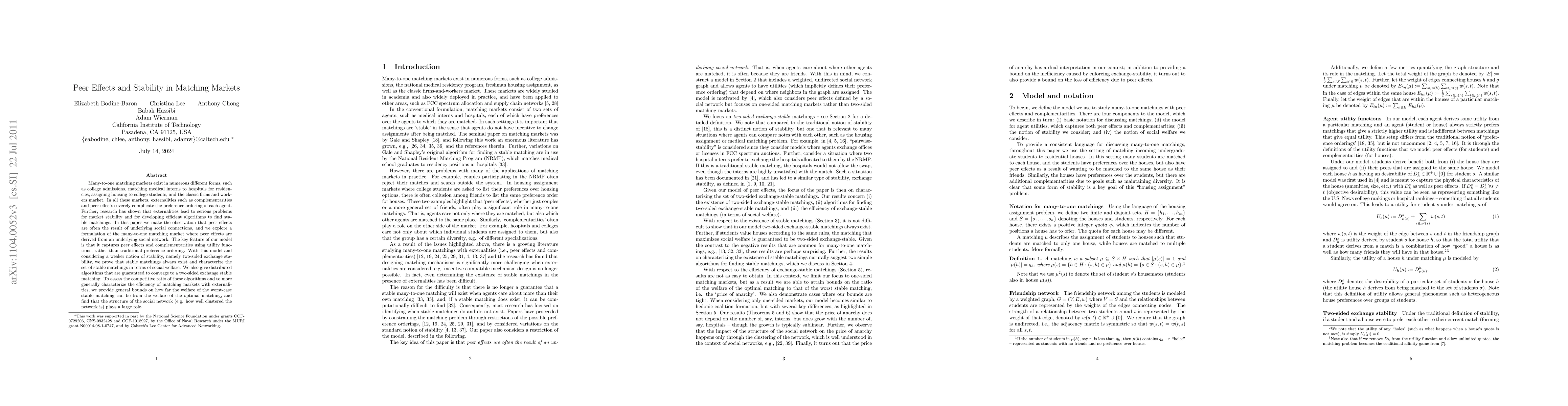 This paper investigates many-to-one matching markets with peer effects, proposing a model where these effects arise from underlying social networks. It demonstrates the existence of stable matchings under two-sided exchange stability and provides distributed algorithms to achieve these stable matches, while also analyzing the efficiency and competitive ratios of these algorithms in relation to the social network structure.