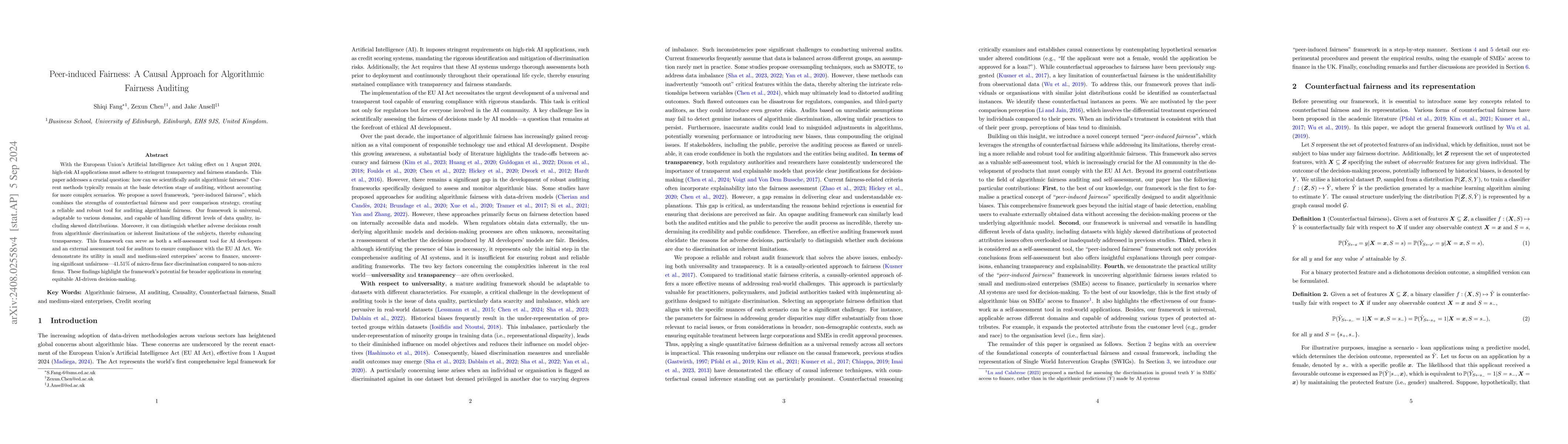 This paper presents "peer-induced fairness", a novel framework for auditing algorithmic fairness, distinguishing discrimination from individual incapacities using counterfactual fairness and causal inference. It offers a flexible, self-audit tool for stakeholders and regulators, addressing data scarcity and imbalance with explainable feedback.