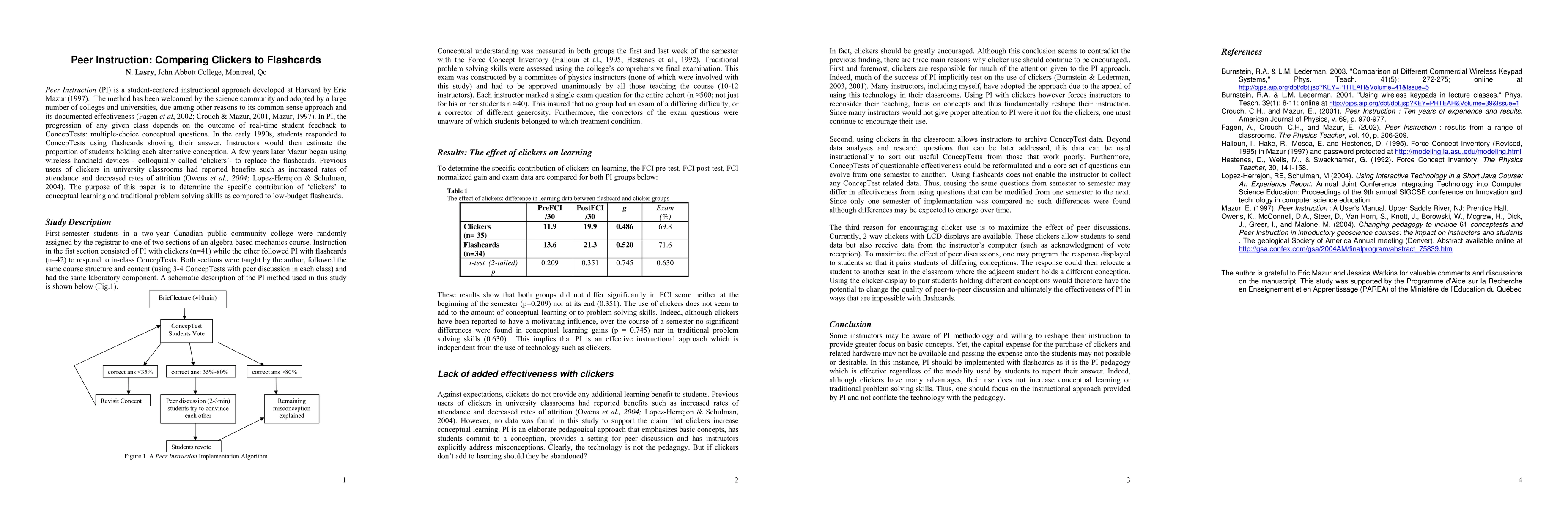 A study found that clickers did not provide a learning advantage compared to low-budget flashcards in peer instruction, but offered teaching advantages. Clickers were used in place of flashcards to measure their contribution to conceptual learning and traditional problem-solving skills.