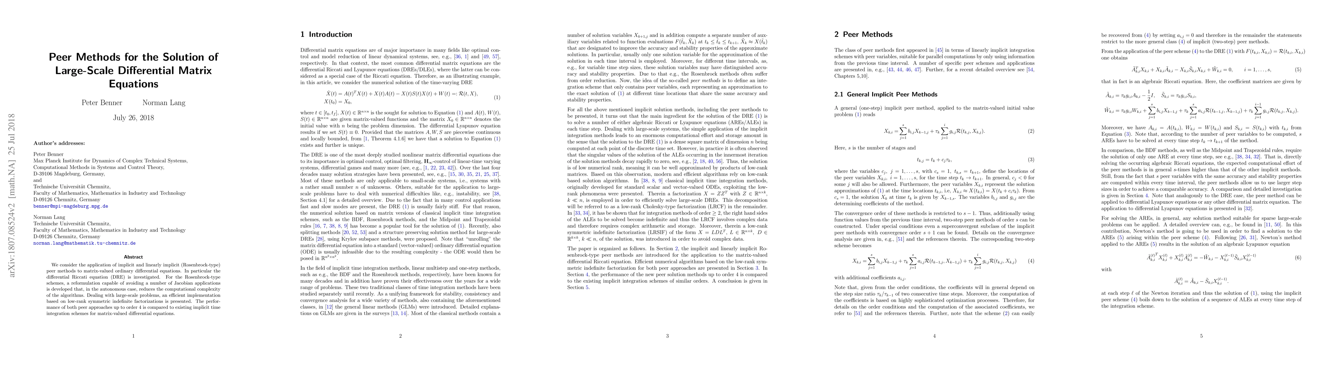 This research paper presents efficient peer methods for solving large-scale differential matrix equations, including a new reformulation of Rosenbrock-type schemes that reduces computational complexity and an implementation based on low-rank factorizations.