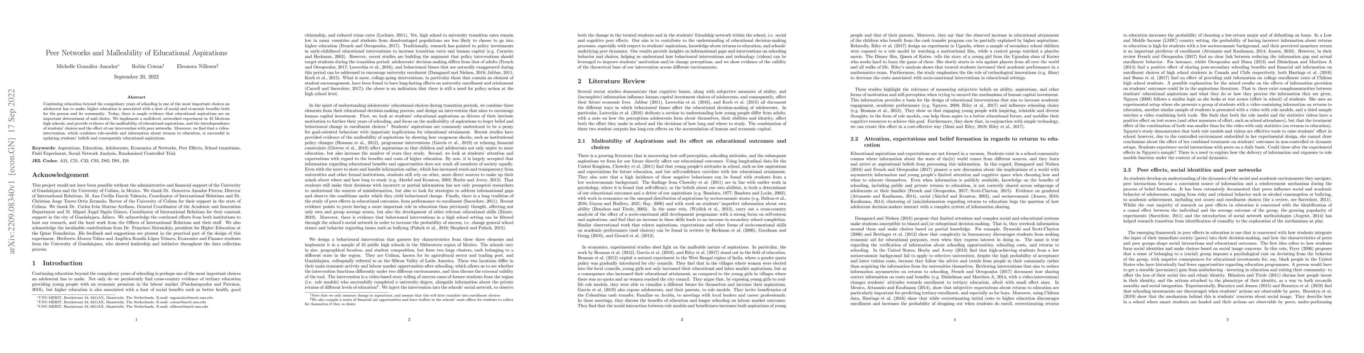 This study demonstrates that educational aspirations in Mexican high school students can be influenced by peer networks, showing that a video intervention featuring role models and educational benefits effectively updates students' beliefs and aspirations. The research highlights the interdependence of students' choices within their peer groups.