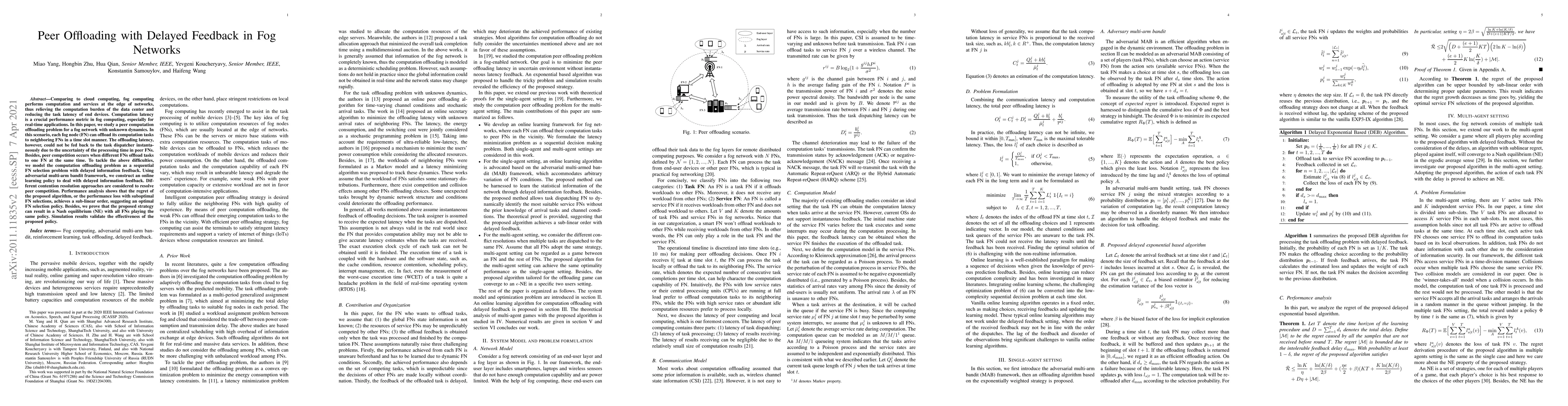 This paper investigates peer computation offloading in fog networks where nodes can offload tasks to neighboring nodes, but delayed feedback complicates task latency management. The authors propose an online learning policy using adversarial multi-arm bandit techniques to handle delayed information and competition among nodes, achieving sub-linear regret and a Nash equilibrium. Simulation results confirm the effectiveness of the proposed strategy.