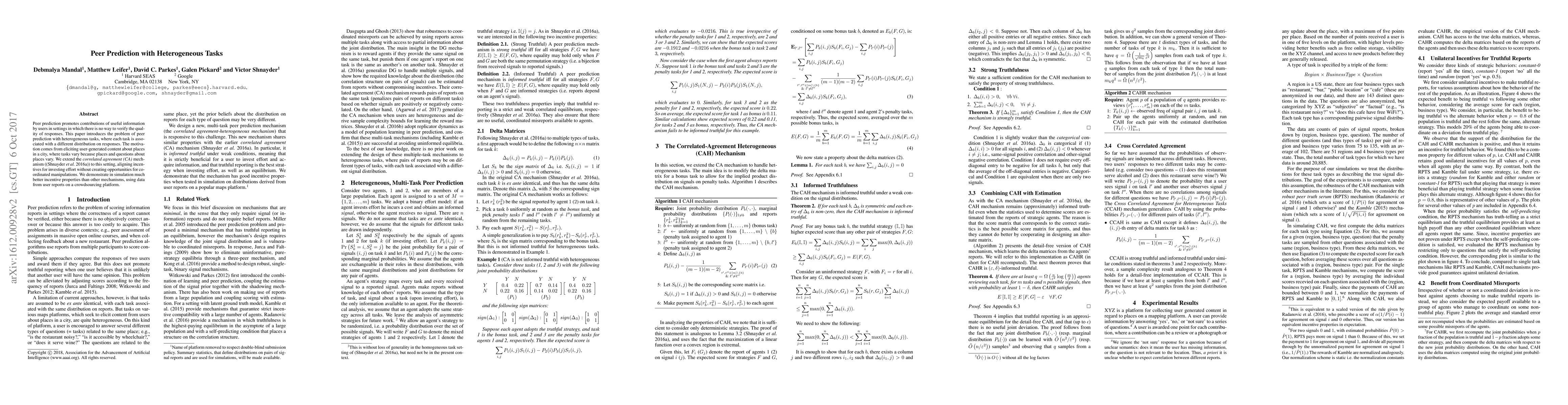 This paper extends the correlated agreement mechanism for multi-task peer prediction to handle heterogeneous tasks with different response distributions. It proves the generalized mechanism to be informed truthful, encouraging users to invest effort and report truthfully, and demonstrates its effectiveness through simulations based on Google Local Guides data.
