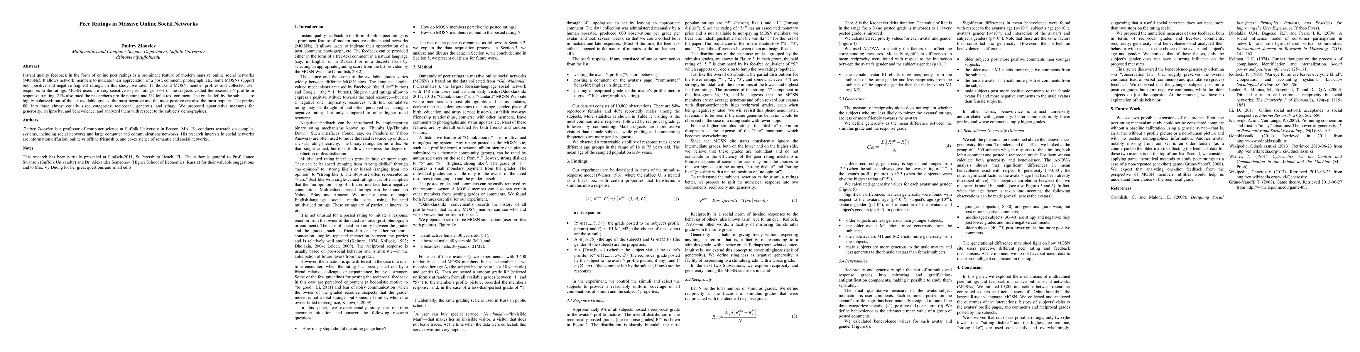 This study examines peer ratings in massive online social networks (MOSNs), finding that users respond strongly to such feedback. Users showed sensitivity to ratings, with significant engagement, and the grades were highly polarized towards the extremes. Measures of generosity, reciprocity, and benevolence were proposed and analyzed based on user demographics.