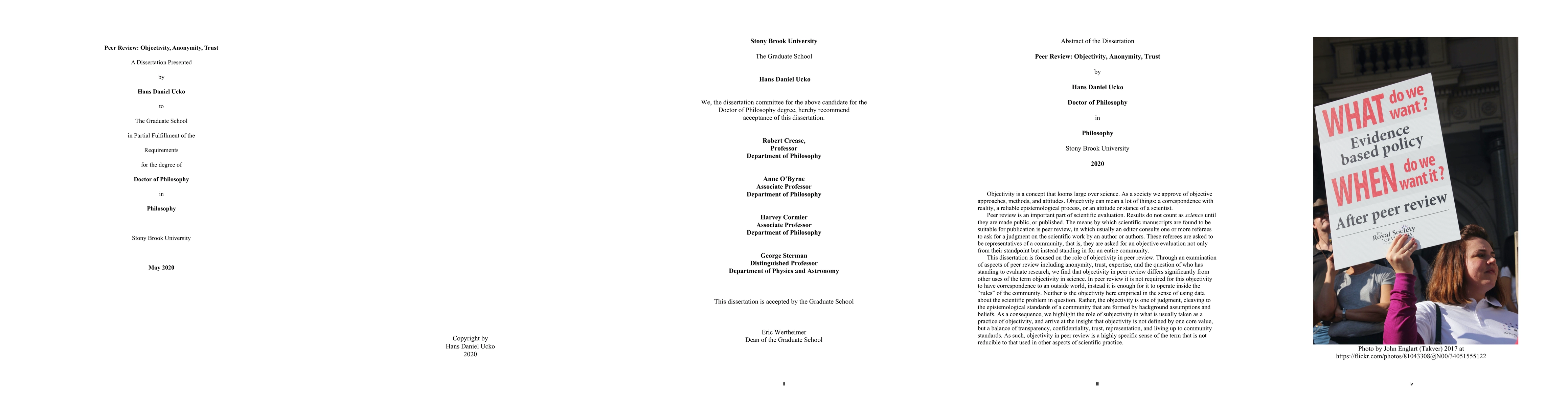This dissertation is focused on the role of objectivity in peer review. Through an examination of aspects of peer review including anonymity, trust, expertise, and the question of who has standing to evaluate research, we find that objectivity in peer review differs significantly from other uses of the term objectivity in science. In peer review it is not required for this objectivity to have correspondence to an outside world, instead it is enough for it to operate inside the "rules" of the community. Neither is the objectivity here empirical in the sense of using data about the scientific problem in question. Rather, the objectivity is one of judgment, cleaving to the epistemological standards of a community that are formed by background assumptions and beliefs. As a consequence, we highlight the role of subjectivity in what is usually taken as a practice of objectivity, and arrive at the insight that objectivity is not defined by one core value, but a balance of transparency, confidentiality, trust, representation, and living up to community standards. As such, objectivity in peer review is a highly specific sense of the term that is not reducible to that used in other aspects of scientific practice.