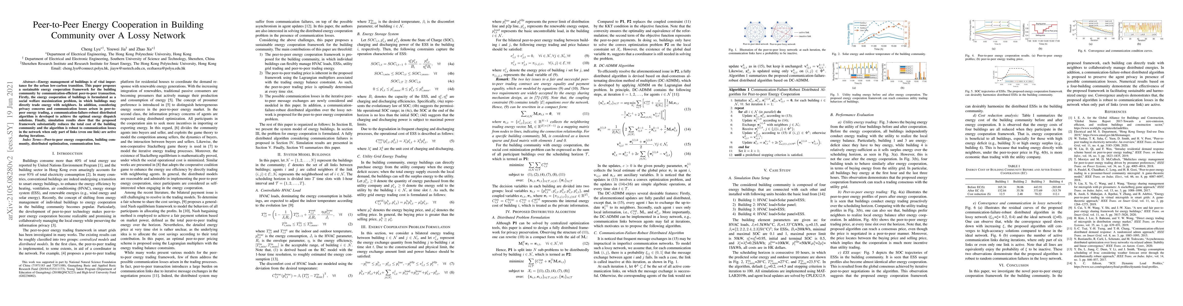 This paper proposes a sustainable peer-to-peer energy cooperation framework for building communities, aiming to maximize social welfare through direct energy trading. It develops a robust distributed algorithm to handle communication losses, demonstrating significant cost reduction and resilience in simulations.