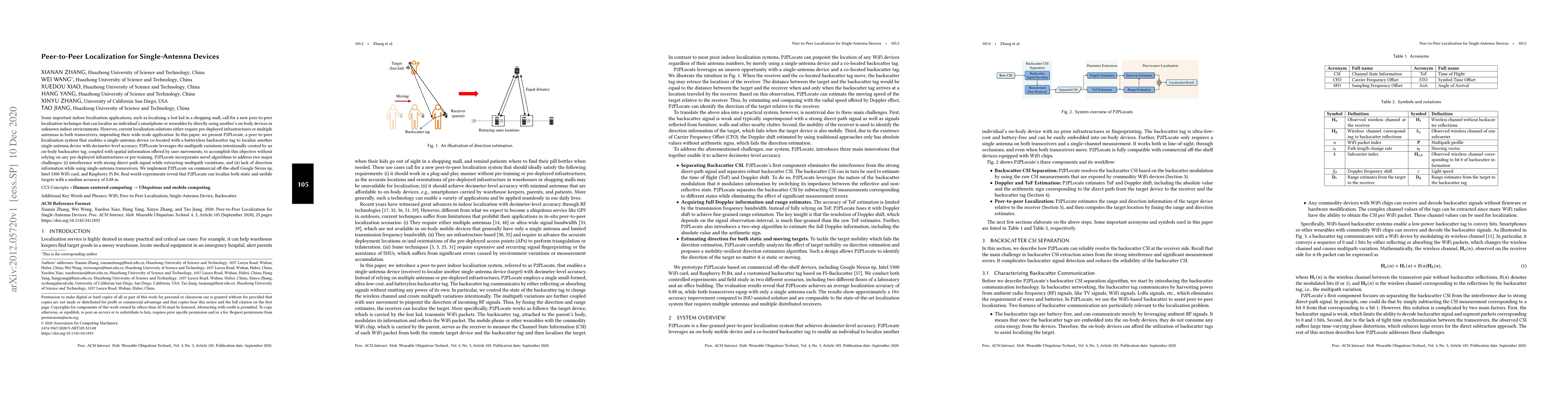 Some important indoor localization applications, such as localizing a lost kid in a shopping mall, call for a new peer-to-peer localization technique that can localize an individual's smartphone or wearables by directly using another's on-body devices in unknown indoor environments. However, current localization solutions either require pre-deployed infrastructures or multiple antennas in both transceivers, impending their wide-scale application. In this paper, we present P2PLocate, a peer-to-peer localization system that enables a single-antenna device co-located with a batteryless backscatter tag to localize another single-antenna device with decimeter-level accuracy. P2PLocate leverages the multipath variations intentionally created by an on-body backscatter tag, coupled with spatial information offered by user movements, to accomplish this objective without relying on any pre-deployed infrastructures or pre-training. P2PLocate incorporates novel algorithms to address two major challenges: (i) interference with strong direct-path signal while extracting multipath variations, and (ii) lack of direction information while using single-antenna transceivers. We implement P2PLocate on commercial off-the-shelf Google Nexus 6p, Intel 5300 WiFi card, and Raspberry Pi B4. Real-world experiments reveal that P2PLocate can localize both static and mobile targets with a median accuracy of 0.88 m.