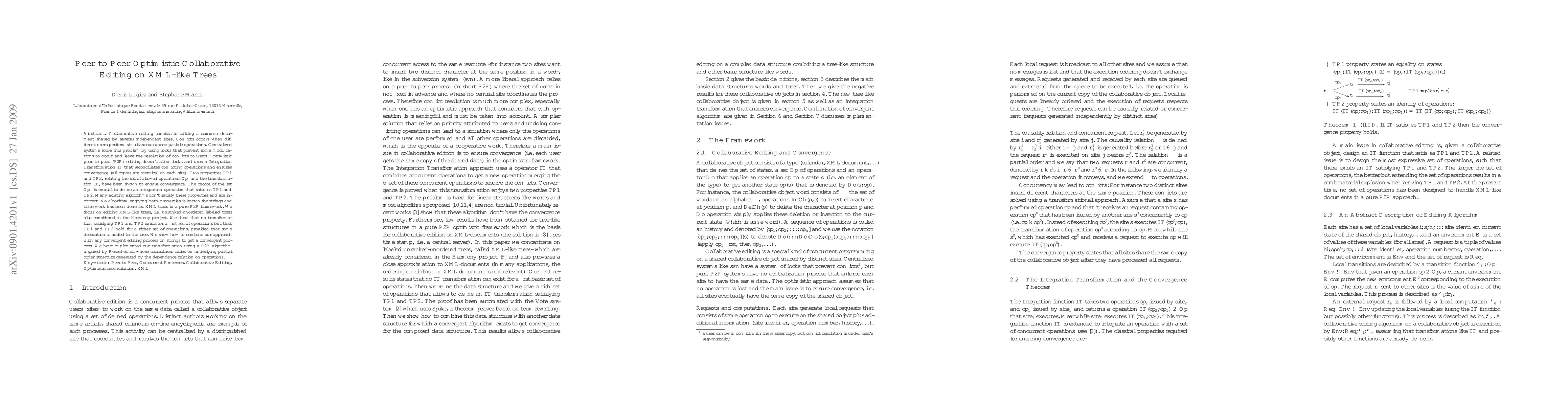This paper explores optimistic collaborative editing in peer-to-peer systems for XML-like trees, addressing conflicts without locks. It demonstrates that while no transformation can satisfy required properties for a basic set of operations, a richer set does, and it combines this approach with string-based convergent editing to achieve overall convergence.