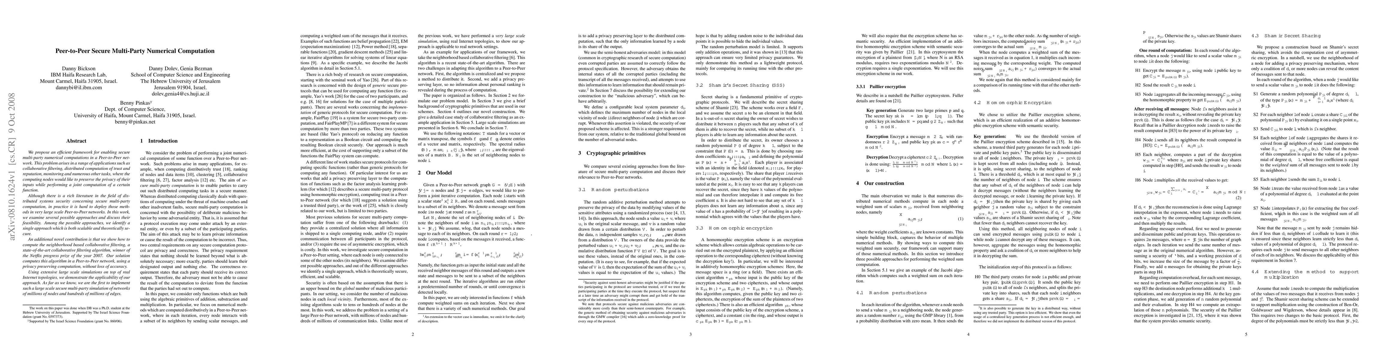 We propose an efficient framework for enabling secure multi-party numerical computations in a Peer-to-Peer network. This problem arises in a range of applications such as collaborative filtering, distributed computation of trust and reputation, monitoring and numerous other tasks, where the computing nodes would like to preserve the privacy of their inputs while performing a joint computation of a certain function. Although there is a rich literature in the field of distributed systems security concerning secure multi-party computation, in practice it is hard to deploy those methods in very large scale Peer-to-Peer networks. In this work, we examine several possible approaches and discuss their feasibility. Among the possible approaches, we identify a single approach which is both scalable and theoretically secure. An additional novel contribution is that we show how to compute the neighborhood based collaborative filtering, a state-of-the-art collaborative filtering algorithm, winner of the Netflix progress prize of the year 2007. Our solution computes this algorithm in a Peer-to-Peer network, using a privacy preserving computation, without loss of accuracy. Using extensive large scale simulations on top of real Internet topologies, we demonstrate the applicability of our approach. As far as we know, we are the first to implement such a large scale secure multi-party simulation of networks of millions of nodes and hundreds of millions of edges.