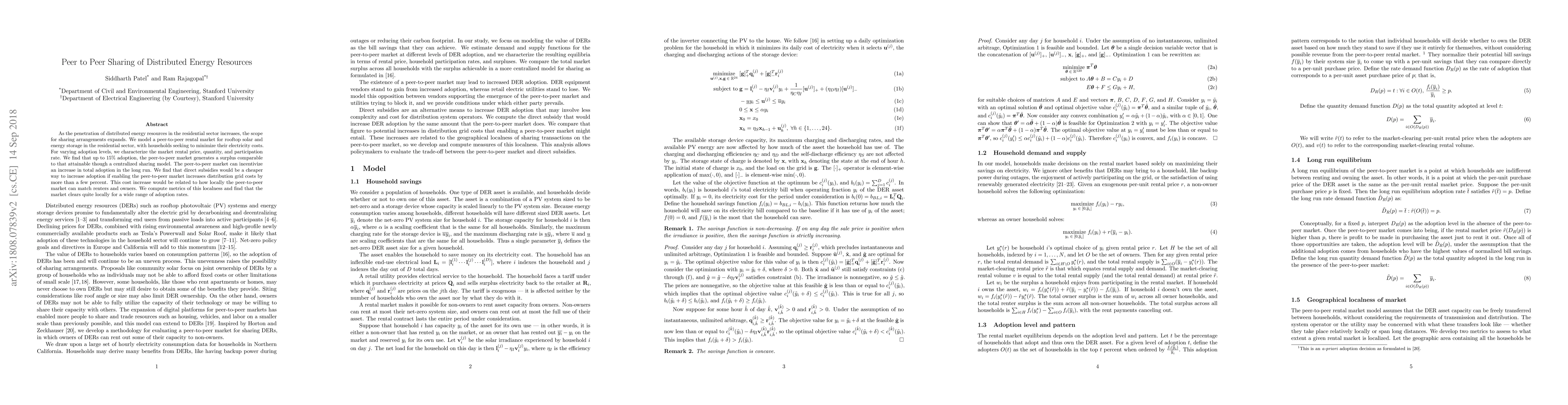 This research models a peer-to-peer rental market for rooftop solar and energy storage, finding that up to 15% adoption, it can generate comparable surplus to centralized models. It suggests direct subsidies may be more cost-effective than enabling peer-to-peer markets if it increases grid costs by more than a few percent.