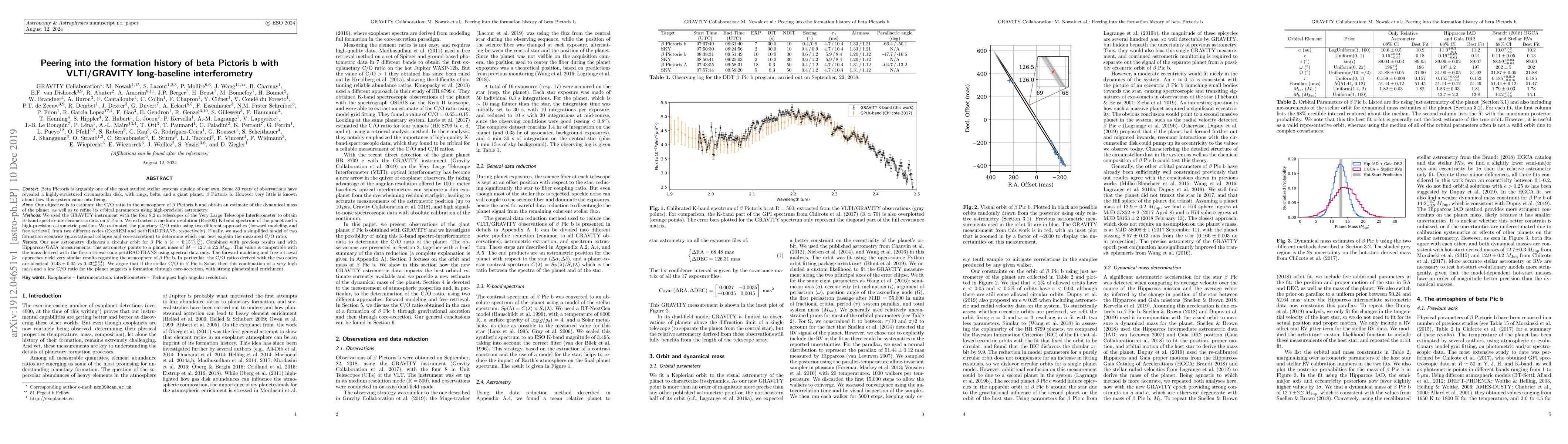 Our objective is to estimate the C/O ratio in the atmosphere of beta Pictoris b and obtain an estimate of the dynamical mass of the planet, as well as to refine its orbital parameters using high-precision astrometry. We used the GRAVITY instrument with the four 8.2 m telescopes of the Very Large Telescope Interferometer to obtain K-band spectro-interferometric data on $\beta$ Pic b. We extracted a medium resolution (R=500) K-band spectrum of the planet and a high-precision astrometric position. We estimated the planetary C/O ratio using two different approaches (forward modeling and free retrieval) from two different codes (ExoREM and petitRADTRANS, respectively). Finally, we used a simplified model of two formation scenarios (gravitational collapse and core-accretion) to determine which can best explain the measured C/O ratio. Our new astrometry disfavors a circular orbit for $\beta$ Pic b ($e=0.15^{+0.05}_{-0.04}$). Combined with previous results and with Hipparcos/GAIA measurements, this astrometry points to a planet mass of $M = 12.7\pm{}2.2\,M_\mathrm{Jup}$. This value is compatible with the mass derived with the free-retrieval code petitRADTRANS using spectral data only. The forward modeling and free-retrieval approches yield very similar results regarding the atmosphere of beta Pic b. In particular, the C/O ratios derived with the two codes are identical ($0.43\pm{}0.05$ vs $0.43^{+0.04}_{-0.03}$). We argue that if the stellar C/O in $\beta$ Pic is Solar, then this combination of a very high mass and a low C/O ratio for the planet suggests a formation through core-accretion, with strong planetesimal enrichment.