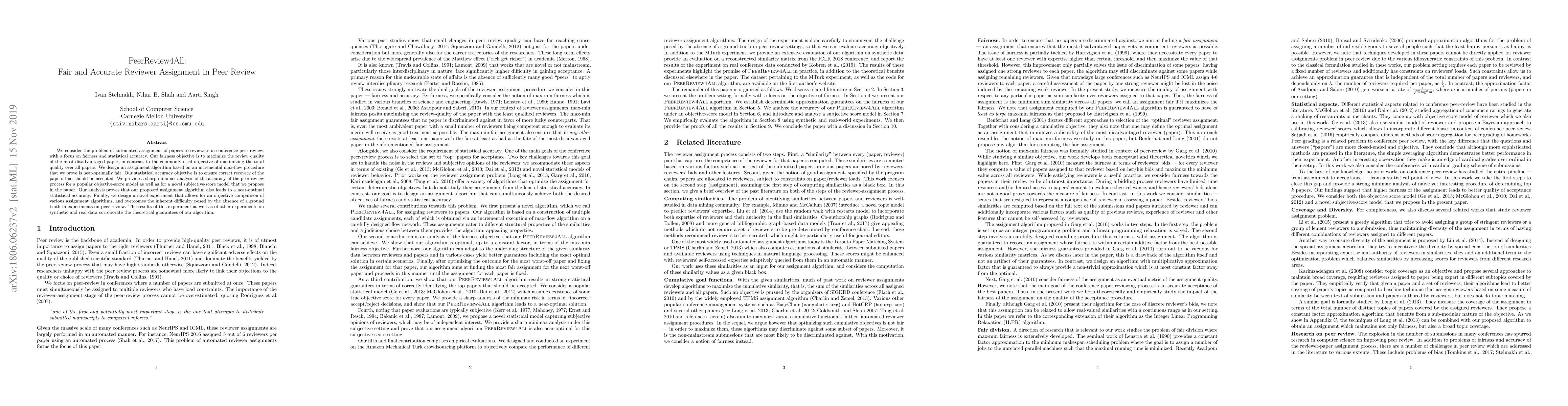 The paper proposes an algorithm for fair and accurate reviewer assignment in conference peer review, focusing on maximizing review quality for the most disadvantaged paper and ensuring statistical accuracy in acceptance decisions. The algorithm is shown to be near-optimally fair and accurate through theoretical analysis and experimental validation.
