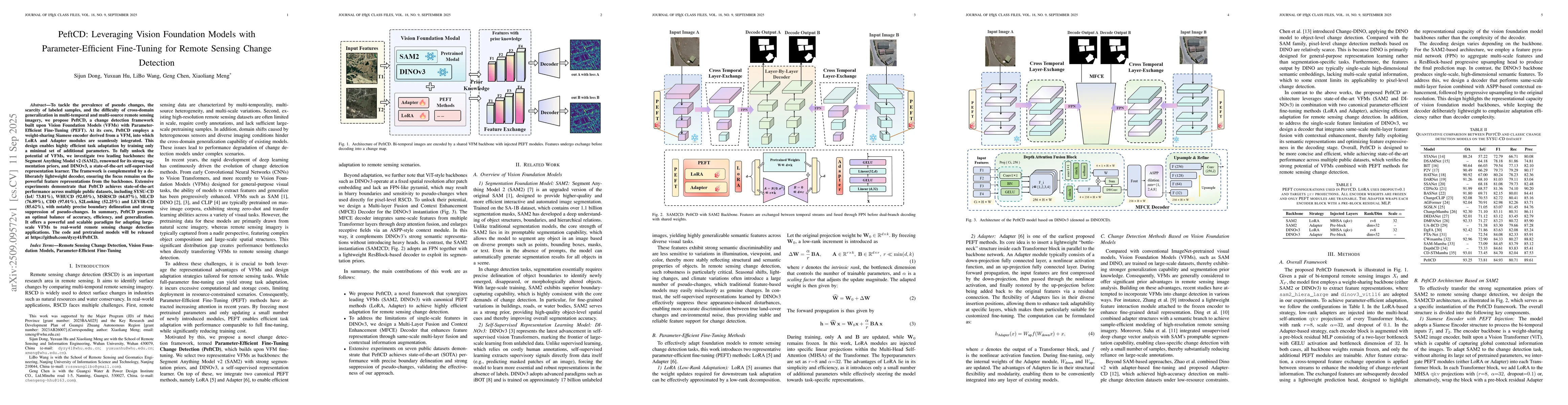 To tackle the prevalence of pseudo changes, the scarcity of labeled samples, and the difficulty of cross-domain generalization in multi-temporal and multi-source remote sensing imagery, we propose PeftCD, a change detection framework built upon Vision Foundation Models (VFMs) with Parameter-Efficient Fine-Tuning (PEFT). At its core, PeftCD employs a weight-sharing Siamese encoder derived from a VFM, into which LoRA and Adapter modules are seamlessly integrated. This design enables highly efficient task adaptation by training only a minimal set of additional parameters. To fully unlock the potential of VFMs, we investigate two leading backbones: the Segment Anything Model v2 (SAM2), renowned for its strong segmentation priors, and DINOv3, a state-of-the-art self-supervised representation learner. The framework is complemented by a deliberately lightweight decoder, ensuring the focus remains on the powerful feature representations from the backbones. Extensive experiments demonstrate that PeftCD achieves state-of-the-art performance across multiple public datasets, including SYSU-CD (IoU 73.81%), WHUCD (92.05%), MSRSCD (64.07%), MLCD (76.89%), CDD (97.01%), S2Looking (52.25%) and LEVIR-CD (85.62%), with notably precise boundary delineation and strong suppression of pseudo-changes. In summary, PeftCD presents an optimal balance of accuracy, efficiency, and generalization. It offers a powerful and scalable paradigm for adapting large-scale VFMs to real-world remote sensing change detection applications. The code and pretrained models will be released at https://github.com/dyzy41/PeftCD.