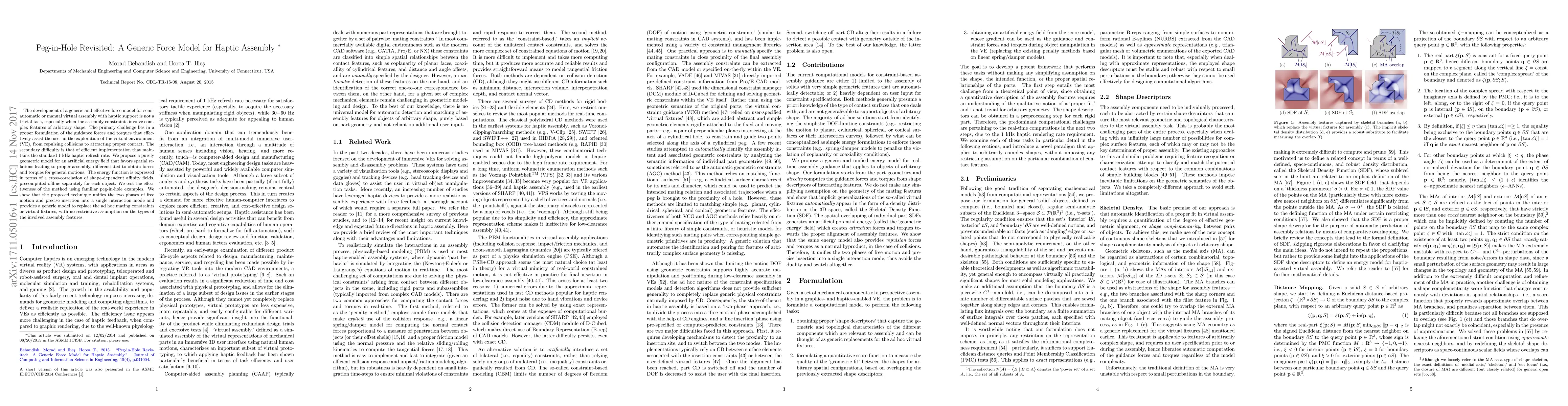 The paper proposes a generic force model for haptic assembly using a purely geometric model for an artificial energy field that favors spatial relations leading to proper assembly. This model is differentiated to obtain forces and torques for general motions, precomputed offline for each object separately.
