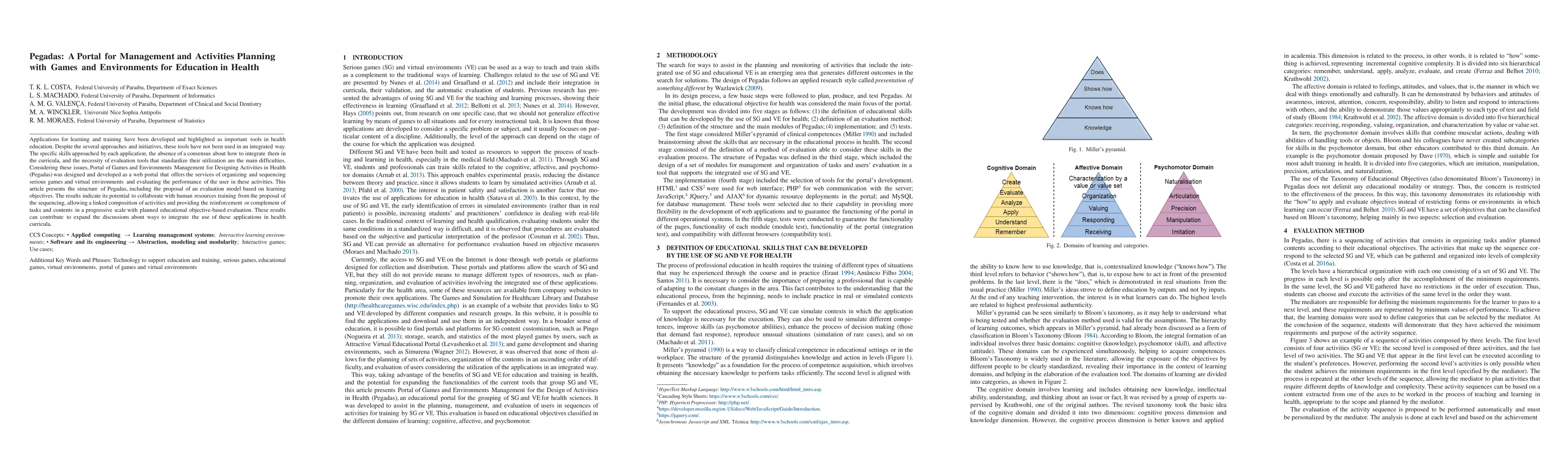 Pegadas is a web portal designed to integrate serious games and virtual environments for health education, addressing the lack of consensus in curriculum integration and standardized evaluation tools. It offers a structured approach to sequencing activities and evaluating user performance, potentially enhancing human resources training in health education.