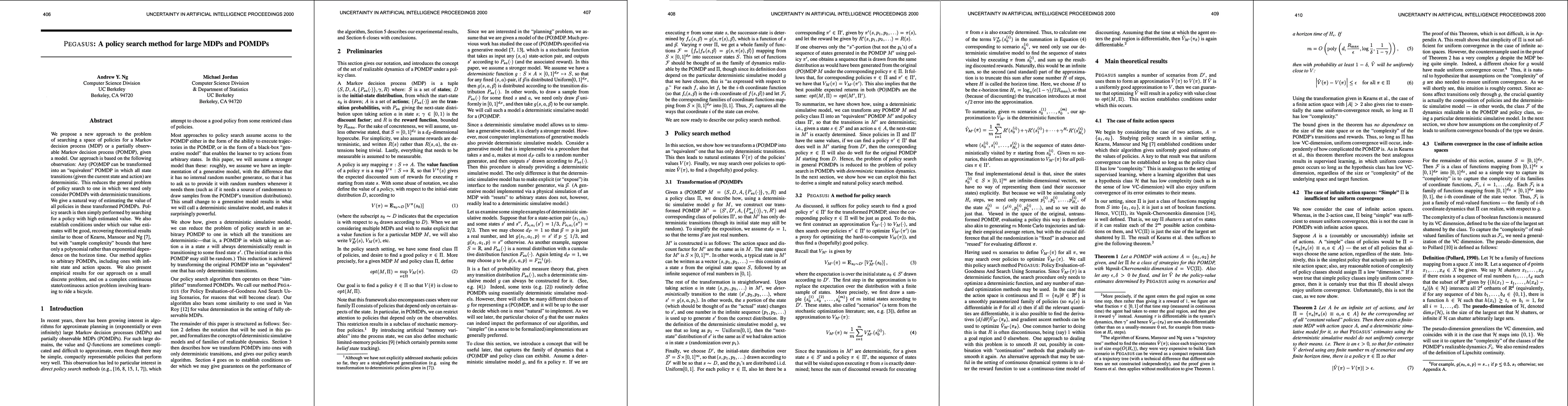 PEGASUS is a novel policy search method for large MDPs and POMDPs that transforms any (PO)MDP into an equivalent POMDP with deterministic transitions, enabling efficient policy search. It provides strong theoretical results and empirical success in both discrete and continuous environments.