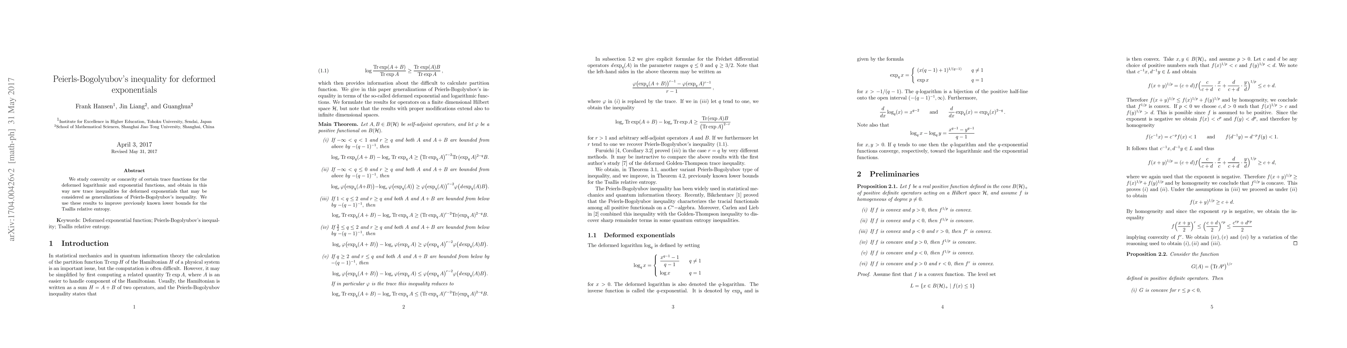 We study convexity or concavity of certain trace functions for the deformed logarithmic and exponential functions, and obtain in this way new trace inequalities for deformed exponentials that may be considered as generalizations of Peierls-Bogolyubov's inequality. We use these results to improve previously known lower bounds for the Tsallis relative entropy.