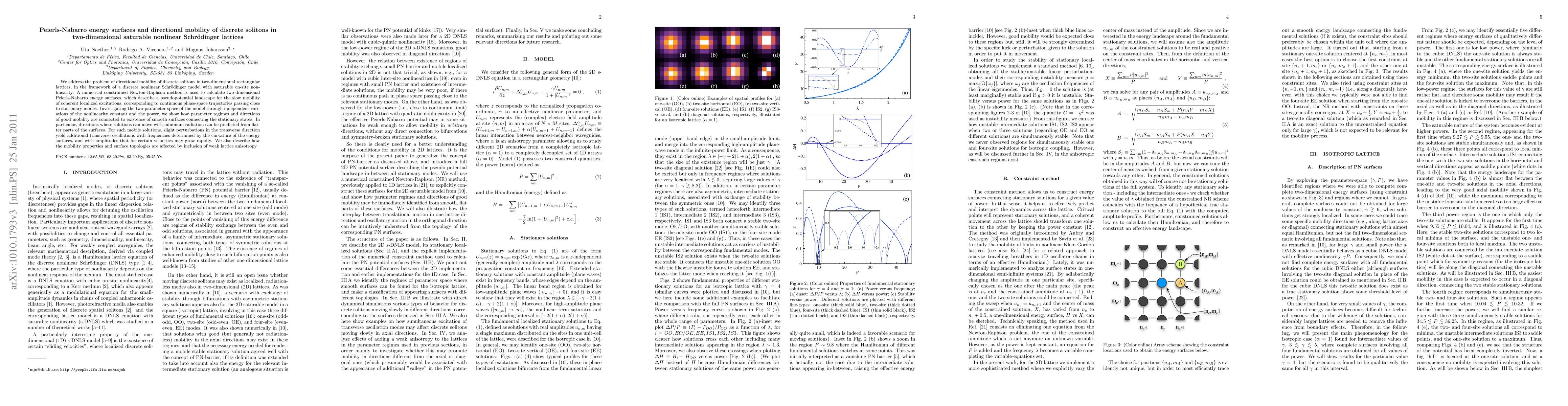 We address the problem of directional mobility of discrete solitons in two-dimensional rectangular lattices, in the framework of a discrete nonlinear Schr\"odinger model with saturable on-site nonlinearity. A numerical constrained Newton-Raphson method is used to calculate two-dimensional Peierls-Nabarro energy surfaces, which describe a pseudopotential landscape for the slow mobility of coherent localized excitations, corresponding to continuous phase-space trajectories passing close to stationary modes. Investigating the two-parameter space of the model through independent variations of the nonlinearity constant and the power, we show how parameter regimes and directions of good mobility are connected to existence of smooth surfaces connecting the stationary states. In particular, directions where solutions can move with minimum radiation can be predicted from flatter parts of the surfaces. For such mobile solutions, slight perturbations in the transverse direction yield additional transverse oscillations with frequencies determined by the curvature of the energy surfaces, and with amplitudes that for certain velocities may grow rapidly. We also describe how the mobility properties and surface topologies are affected by inclusion of weak lattice anisotropy.