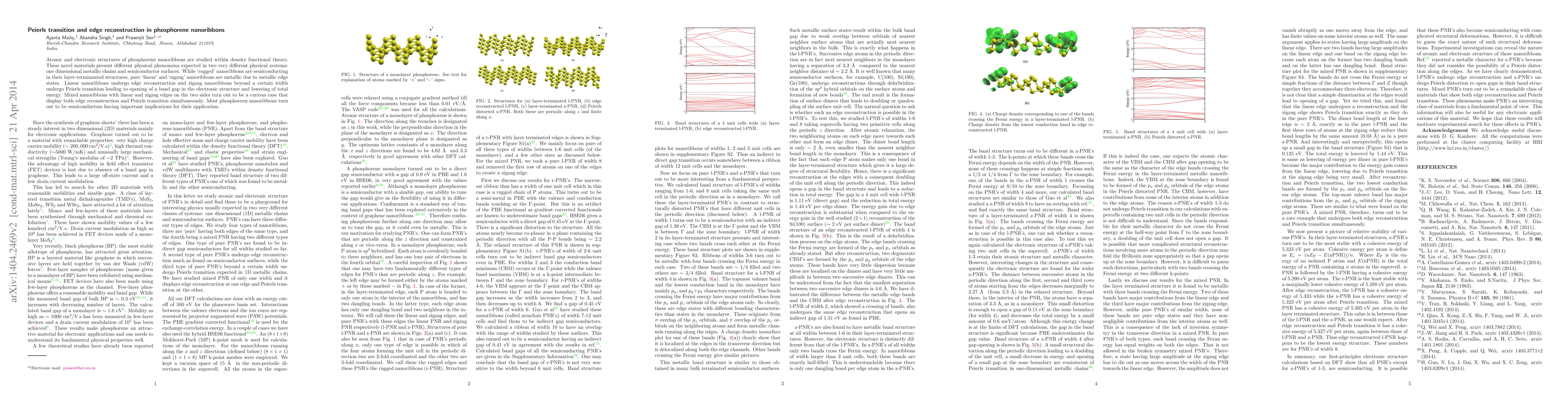 This study utilizes density functional theory to investigate phosphorene nanoribbons, revealing that linear and zigzag structures exhibit metallic edge states and undergo edge reconstruction or Peierls transition, while mixed structures display both phenomena. Most nanoribbons become semiconductors, impacting their potential applications.