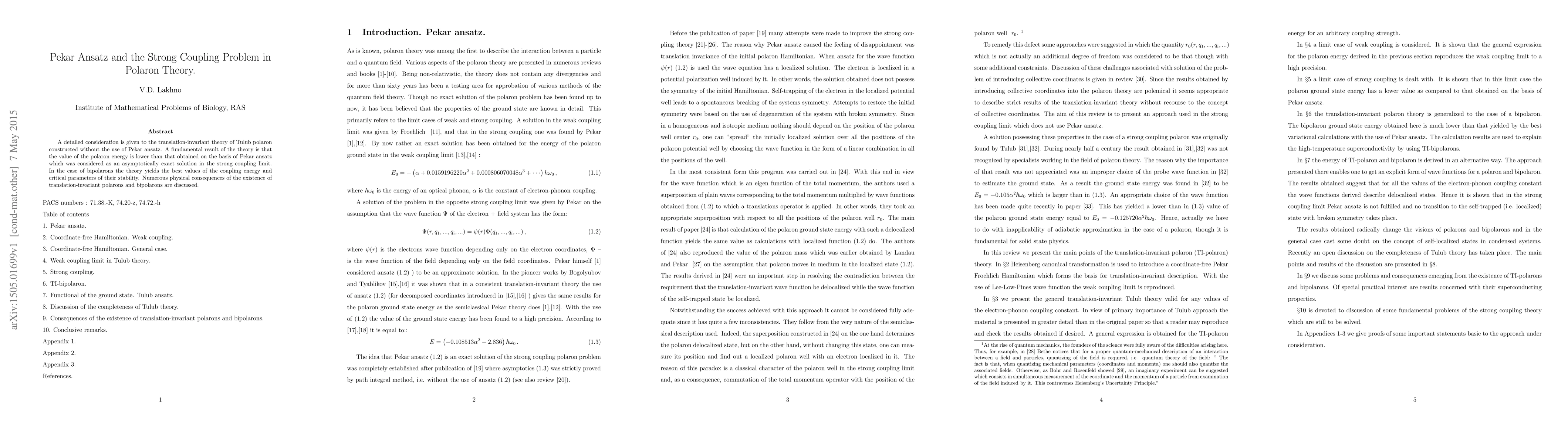 A detailed consideration is given to the translation-invariant theory of Tulub polaron constructed without the use of Pekar ansatz. A fundamental result of the theory is that the value of the polaron energy is lower than that obtained on the basis of Pekar ansatz which was considered as an asymptotically exact solution in the strong coupling limit. In the case of bipolarons the theory yields the best values of the coupling energy and critical parameters of their stability. Numerous physical consequences of the existence of translation-invariant polarons and bipolarons are discussed.