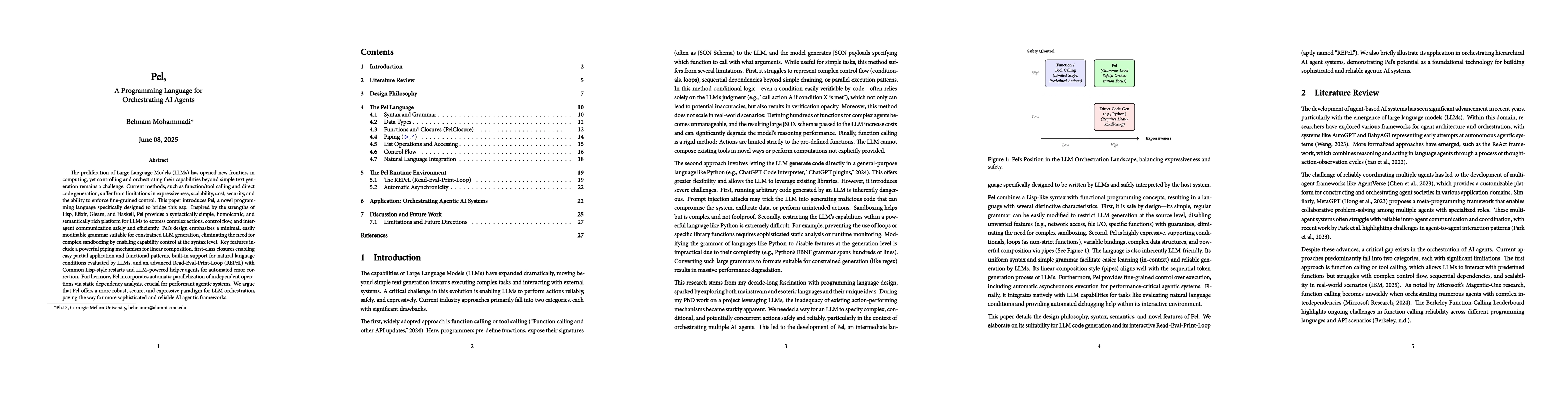 The paper introduces Pel, a programming language designed for orchestrating AI agents, inspired by Lisp, Elixir, Gleam, and Haskell.