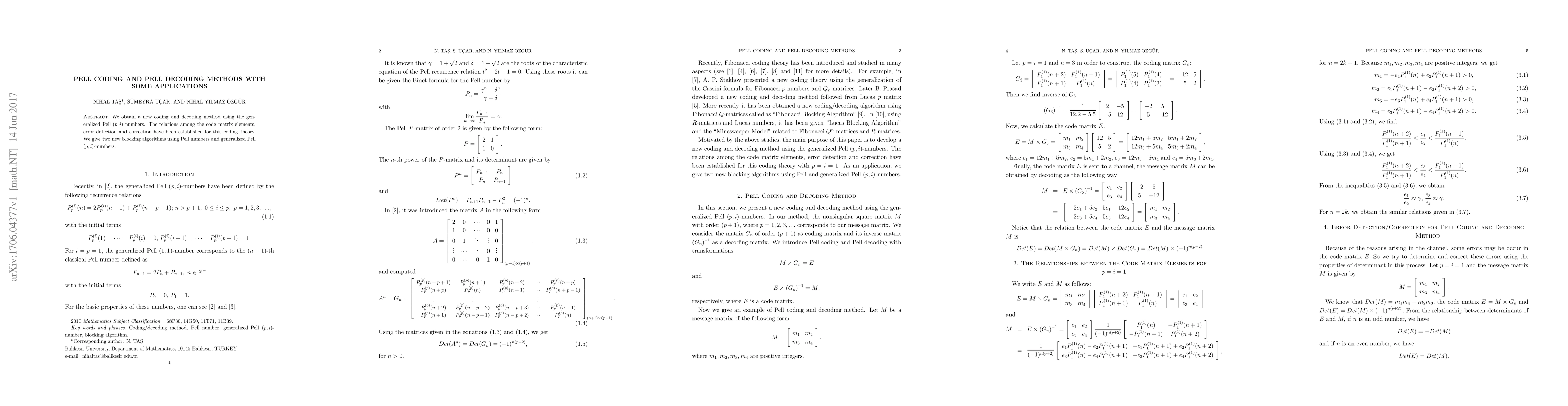 We obtain a new coding and decoding method using the generalized Pell $(p,i)$ -numbers. The relations among the code matrix elements, error detection and correction have been established for this coding theory. We give two new blocking algorithms using Pell numbers and generalized Pell $(p,i)$-numbers.