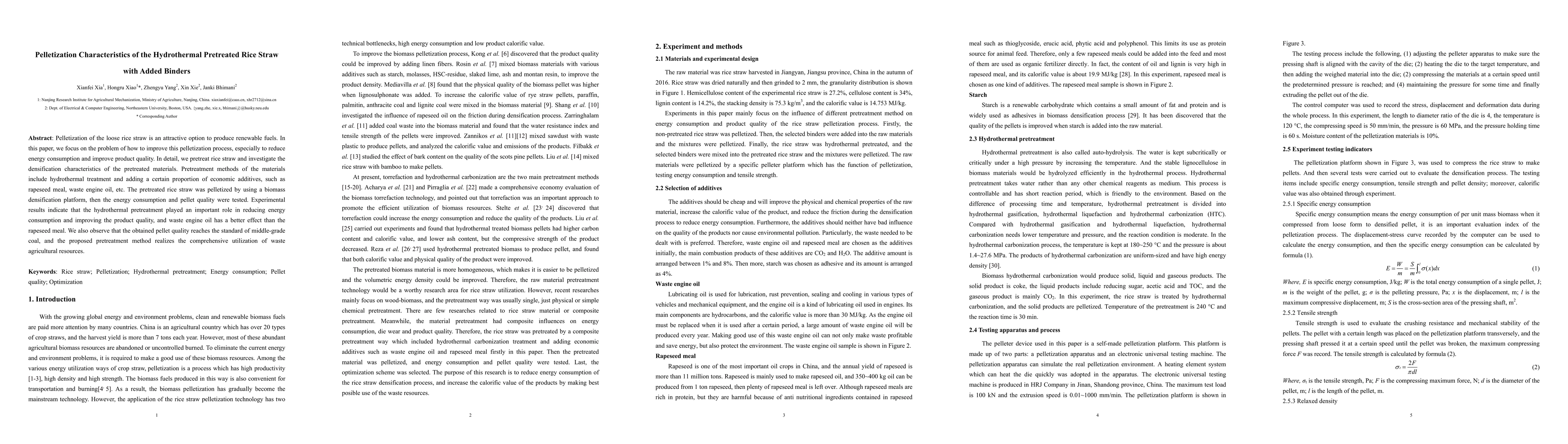 Pelletization of the loose rice straw is an attractive option to produce renewable fuels. In this paper, we focus on the problem of how to improve this pelletization process, especially to reduce energy consumption and improve product quality. In detail, we first pretreat rice straw, and then investigate the densification characteristics of the pretreated materials. Pretreatment methods of the materials include hydrothermal treatment and adding a certain proportion of economic additives, such as rapeseed meal and waste engine oil respectively. In addition, the pretreated rice straw was pelletized by using a biomass densification platform, meanwhile energy consumption and pellet quality were tested. Experimental results indicate that the hydrothermal pretreatment played an important role in reducing energy consumption and improving the product quality, and waste engine oil has a better effect than the rapeseed meal. We also observe that the obtained pellet quality reaches the standard of middle-grade coal, and the proposed pretreatment method realizes the comprehensive utilization of waste agricultural resources.