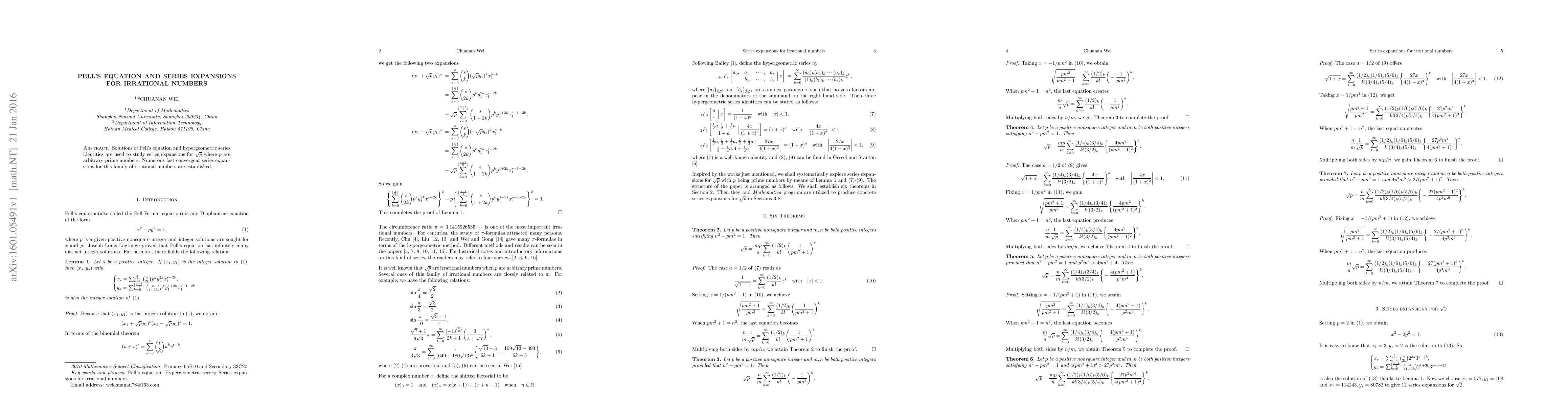 Solutions of Pell's equation and hypergeometric series identities are used to study series expansions for $\sqrt{p}$ where $p$ are arbitrary prime numbers. Numerous fast convergent series expansions for this family of irrational numbers are established.