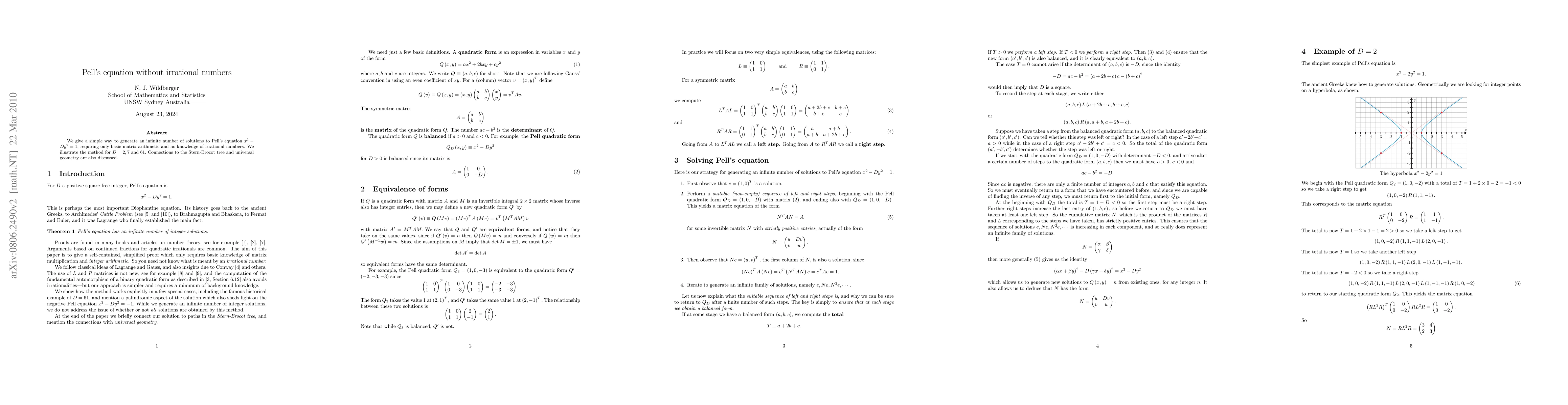 Summary: This paper presents a novel method to solve Pell's equation using an algorithm that avoids irrational numbers and continued fractions, linking the solution process to the structure of the Stern Brocot tree.