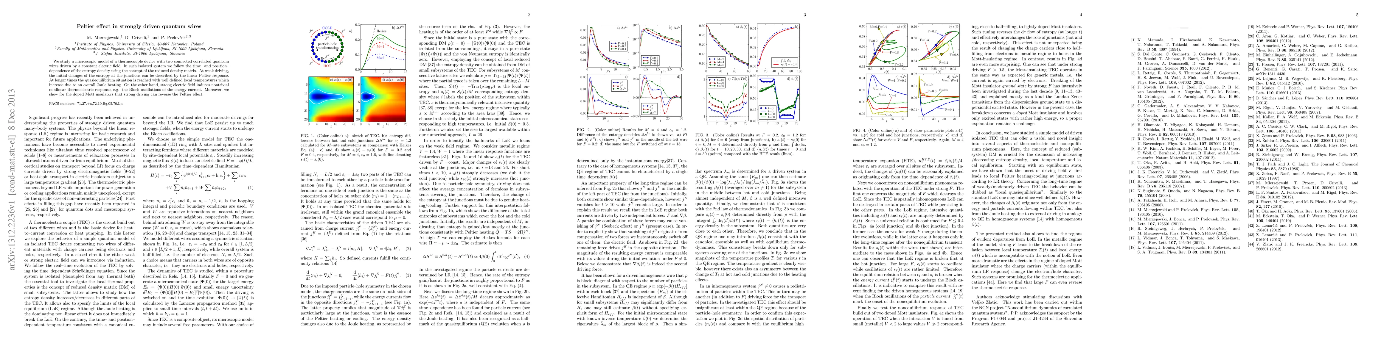 We study a microscopic model of a thermocouple device with two connected correlated quantum wires driven by a constant electric field. In such isolated system we follow the time-- and position--dependence of the entropy density using the concept of the reduced density matrix. At weak driving, the initial changes of the entropy at the junctions can be described by the linear Peltier response. At longer times the quasiequilibrium situation is reached with well defined local temperatures which increase due to an overall Joule heating. On the other hand, strong electric field induces nontrivial nonlinear thermoelectric response, e.g. the Bloch oscillations of the energy current. Moreover, we show for the doped Mott insulators that strong driving can reverse the Peltier effect.