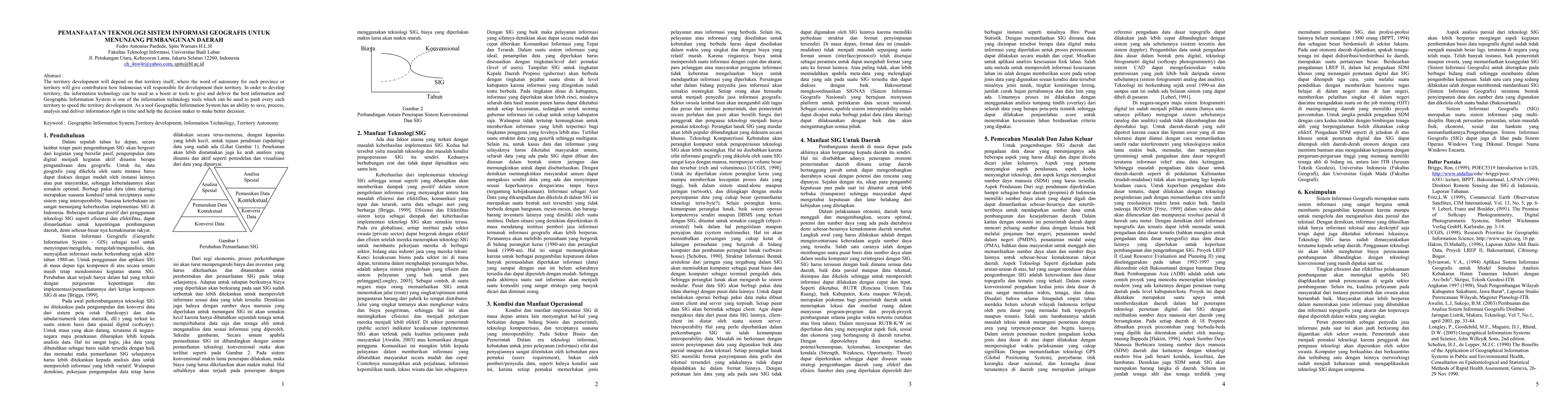 The territory development will depend on that territory itself, where the word of autonomy for each province or territory will give contribution how Indonesian will responsible for development their territory. In order to develop territory, the information technology can be used as a boost or tools to give and deliver the best information and Geographic Information System is one of the information technology tools which can be used to push every each territory to speed the territory development. As a tool Geographic Information System has an ability to save, process, analysis and deliver information right in time and help the decision maker to make better decision.