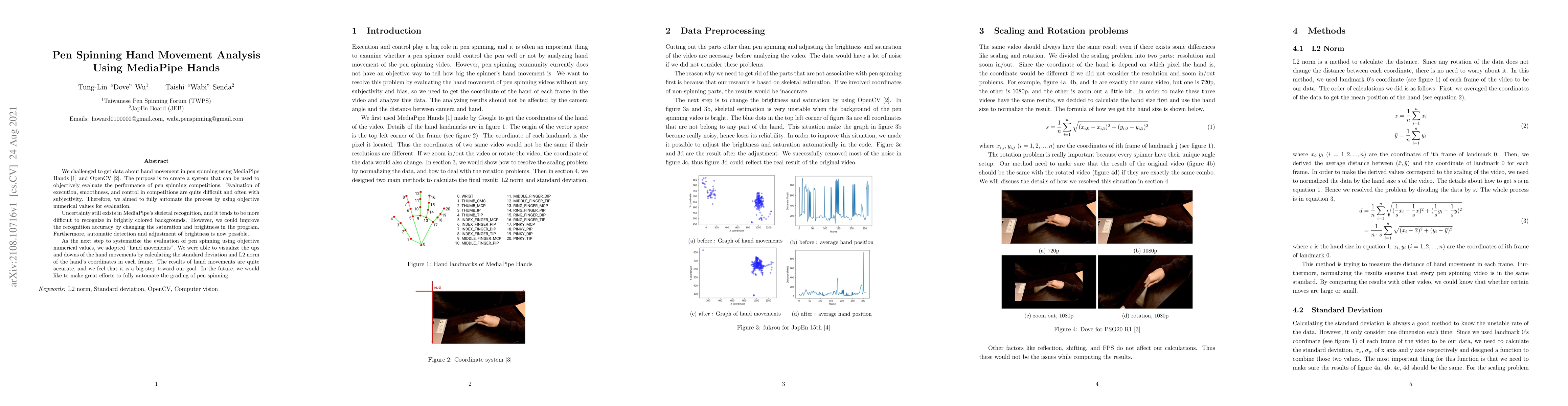 This research uses MediaPipe Hands and OpenCV to analyze hand movements in pen spinning, aiming to create an objective evaluation system for competitions. The study successfully visualizes hand movement fluctuations and plans to automate the grading process in future work.