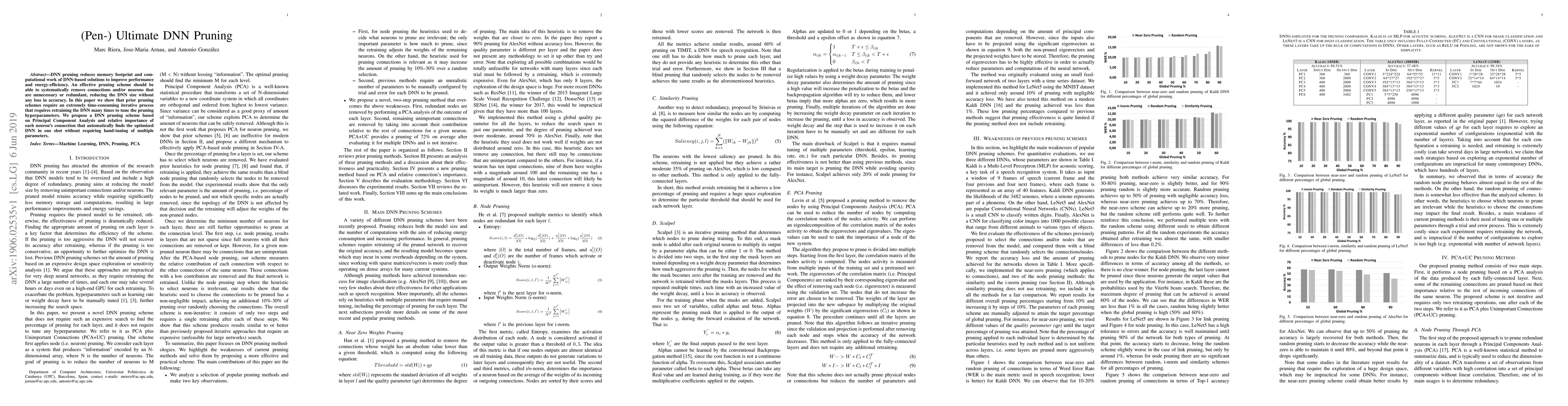 DNN pruning reduces memory footprint and computational work of DNN-based solutions to improve performance and energy-efficiency. An effective pruning scheme should be able to systematically remove connections and/or neurons that are unnecessary or redundant, reducing the DNN size without any loss in accuracy. In this paper we show that prior pruning schemes require an extremely time-consuming iterative process that requires retraining the DNN many times to tune the pruning hyperparameters. We propose a DNN pruning scheme based on Principal Component Analysis and relative importance of each neuron's connection that automatically finds the optimized DNN in one shot without requiring hand-tuning of multiple parameters.