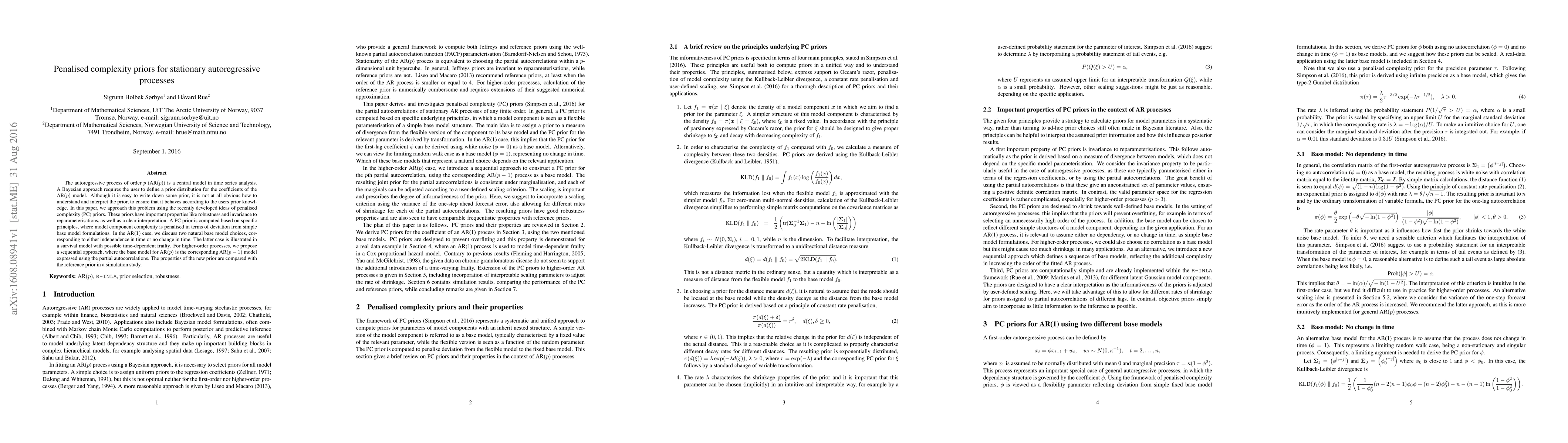 The autoregressive process of order $p$ (AR($p$)) is a central model in time series analysis. A Bayesian approach requires the user to define a prior distribution for the coefficients of the AR($p$) model. Although it is easy to write down some prior, it is not at all obvious how to understand and interpret the prior, to ensure that it behaves according to the users prior knowledge. In this paper, we approach this problem using the recently developed ideas of penalised complexity (PC) priors. These priors have important properties like robustness and invariance to reparameterisations, as well as a clear interpretation. A PC prior is computed based on specific principles, where model component complexity is penalised in terms of deviation from simple base model formulations. In the AR(1) case, we discuss two natural base model choices, corresponding to either independence in time or no change in time. The latter case is illustrated in a survival model with possible time-dependent frailty. For higher-order processes, we propose a sequential approach, where the base model for AR($p$) is the corresponding AR($p-1$) model expressed using the partial autocorrelations. The properties of the new prior are compared with the reference prior in a simulation study.