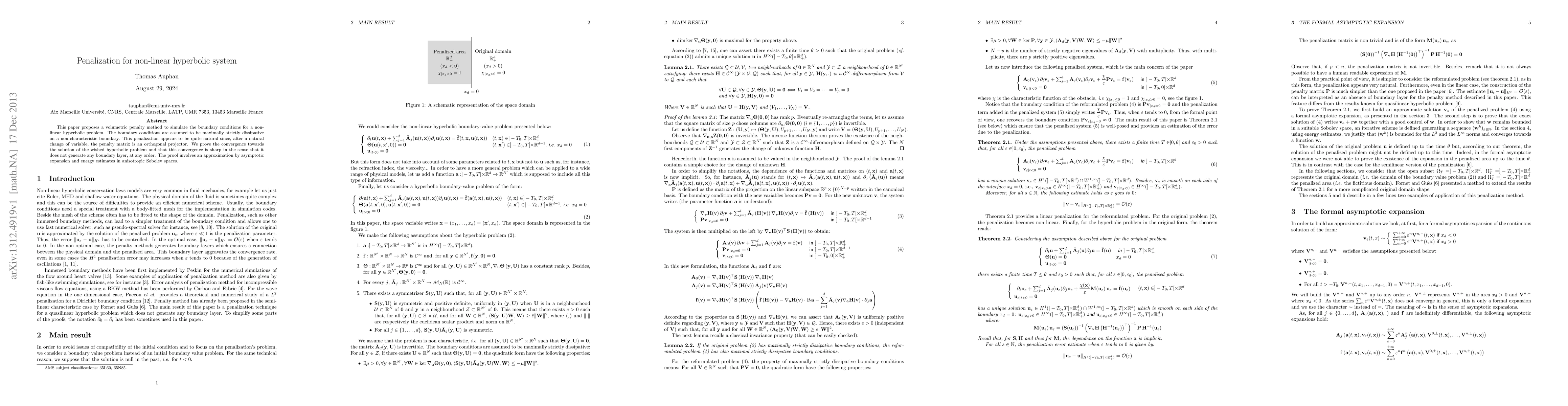 This paper proposes a volumetric penalty method to simulate the boundary conditions for a non-linear hyperbolic problem. The boundary conditions are assumed to be maximally strictly dissipative on a non-characteristic boundary. This penalization appears to be quite natural since, after a natural change of variable, the penalty matrix is an orthogonal projector. We prove the convergence towards the solution of the wished hyperbolic problem and that this convergence is sharp in the sense that it does not generate any boundary layer, at any order. The proof involves an approximation by asymptotic expansion and energy estimates in anisotropic Sobolev spaces.
