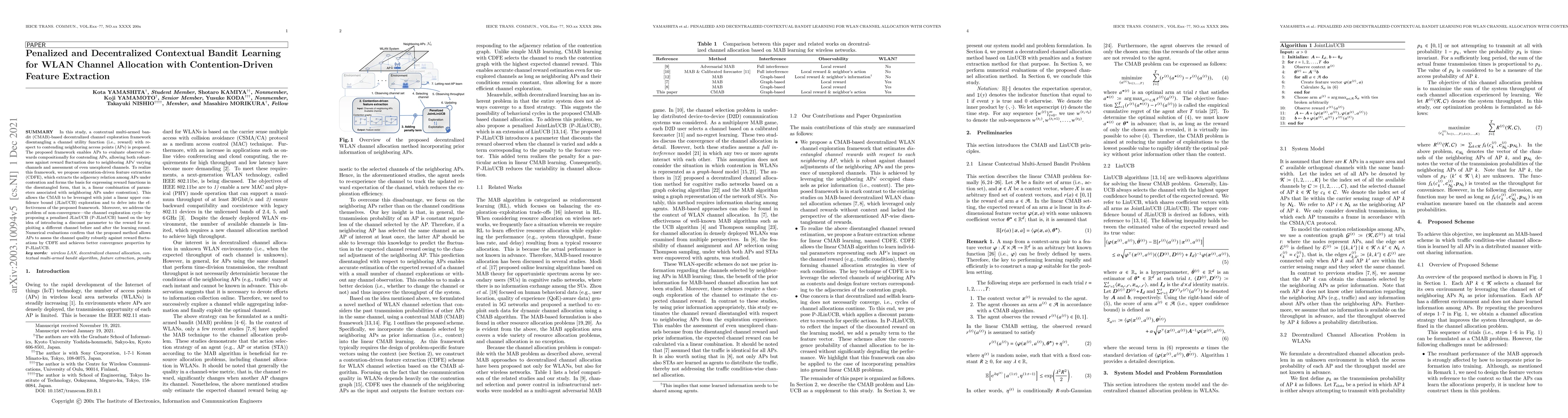 This paper proposes a decentralized contextual multi-armed bandit framework for WLAN channel allocation using contention-driven feature extraction (CDFE) to disentangle channel utility functions. The proposed penalized JLinUCB method addresses non-convergence issues, achieving robust channel quality assessment and better convergence.