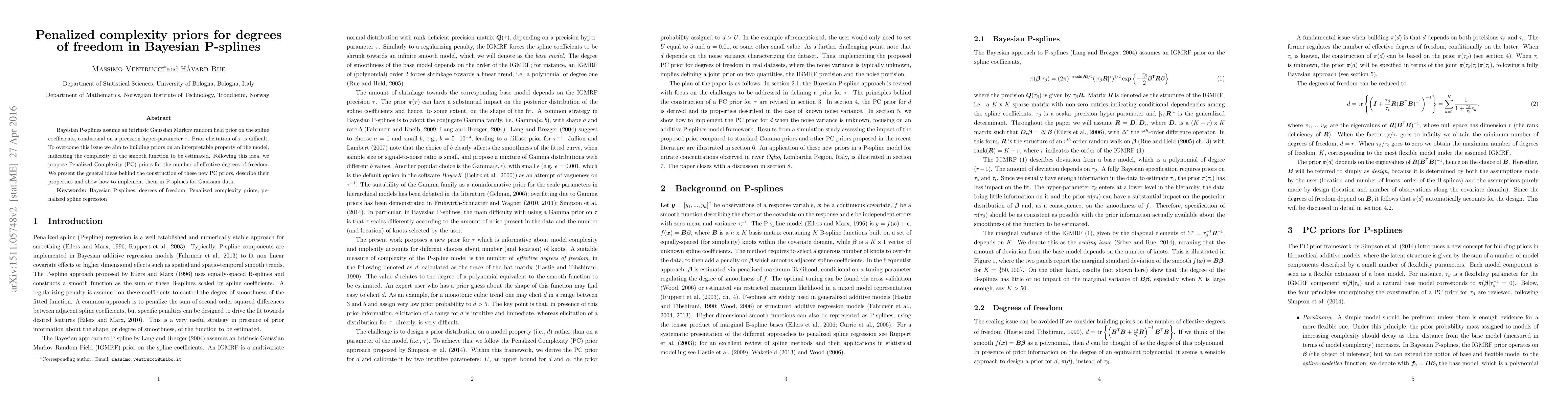 This paper proposes Penalized Complexity (PC) priors for Bayesian P-splines to address the difficulty in eliciting the precision hyper-parameter $\tau$. The PC priors aim to directly control the complexity of the estimated smooth function by focusing on the number of effective degrees of freedom.
