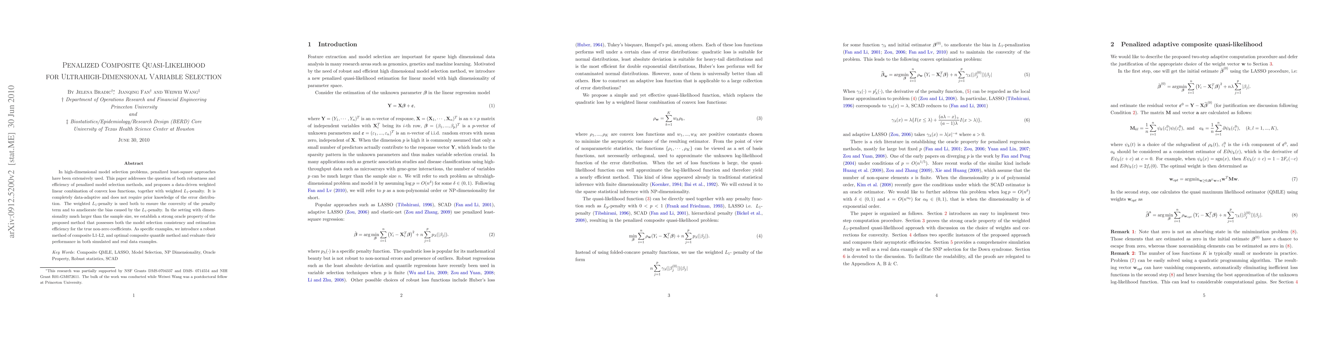 This paper proposes a penalized composite quasi-likelihood method for ultrahigh-dimensional variable selection, combining convex loss functions to enhance robustness and efficiency. The method employs a data-adaptive weighted $L_1$-penalty, demonstrating strong oracle properties, model selection consistency, and estimation efficiency in high-dimensional settings.