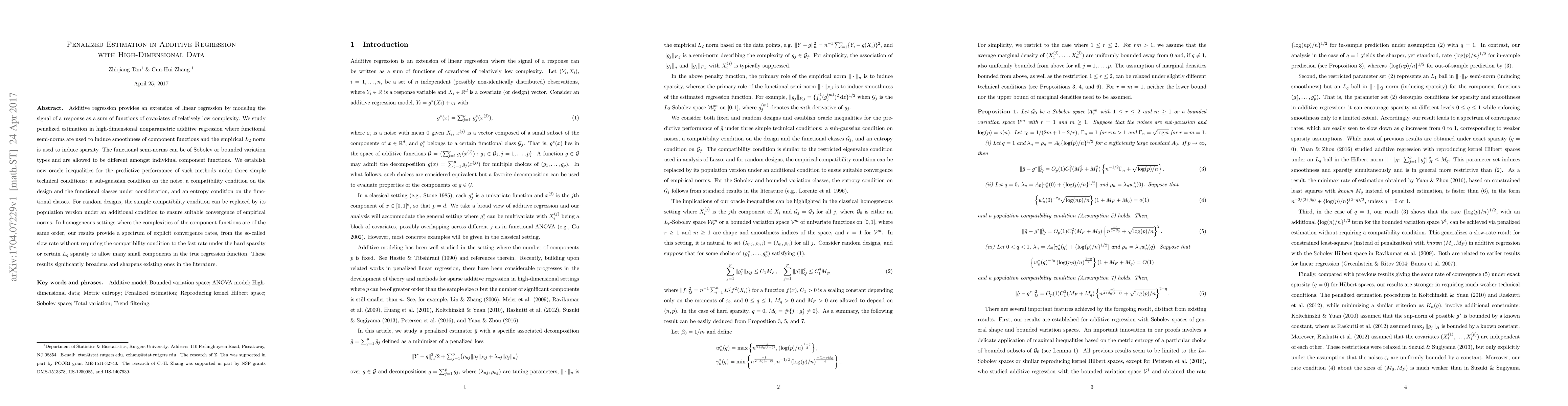 Additive regression provides an extension of linear regression by modeling the signal of a response as a sum of functions of covariates of relatively low complexity. We study penalized estimation in high-dimensional nonparametric additive regression where functional semi-norms are used to induce smoothness of component functions and the empirical $L_2$ norm is used to induce sparsity. The functional semi-norms can be of Sobolev or bounded variation types and are allowed to be different amongst individual component functions. We establish new oracle inequalities for the predictive performance of such methods under three simple technical conditions: a sub-gaussian condition on the noise, a compatibility condition on the design and the functional classes under consideration, and an entropy condition on the functional classes. For random designs, the sample compatibility condition can be replaced by its population version under an additional condition to ensure suitable convergence of empirical norms. In homogeneous settings where the complexities of the component functions are of the same order, our results provide a spectrum of explicit convergence rates, from the so-called slow rate without requiring the compatibility condition to the fast rate under the hard sparsity or certain $L_q$ sparsity to allow many small components in the true regression function. These results significantly broadens and sharpens existing ones in the literature.