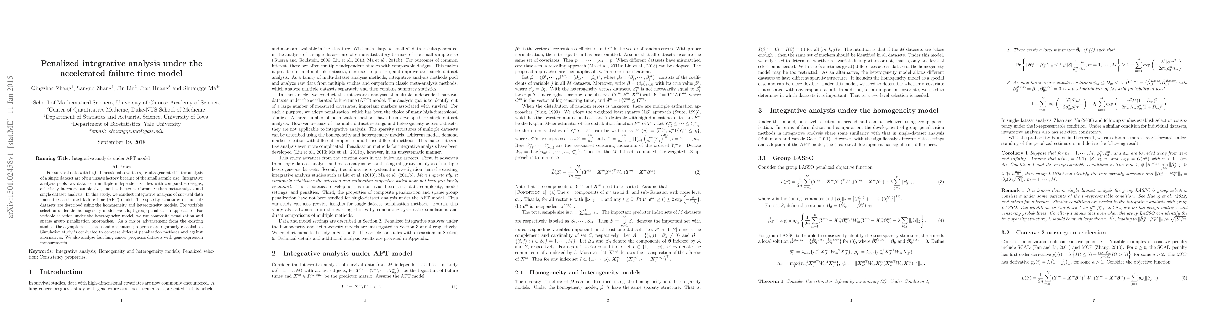 For survival data with high-dimensional covariates, results generated in the analysis of a single dataset are often unsatisfactory because of the small sample size. Integrative analysis pools raw data from multiple independent studies with comparable designs, effectively increases sample size, and has better performance than meta-analysis and single-dataset analysis. In this study, we conduct integrative analysis of survival data under the accelerated failure time (AFT) model. The sparsity structures of multiple datasets are described using the homogeneity and heterogeneity models. For variable selection under the homogeneity model, we adopt group penalization approaches. For variable selection under the heterogeneity model, we use composite penalization and sparse group penalization approaches. As a major advancement from the existing studies, the asymptotic selection and estimation properties are rigorously established. Simulation study is conducted to compare different penalization methods and against alternatives. We also analyze four lung cancer prognosis datasets with gene expression measurements.