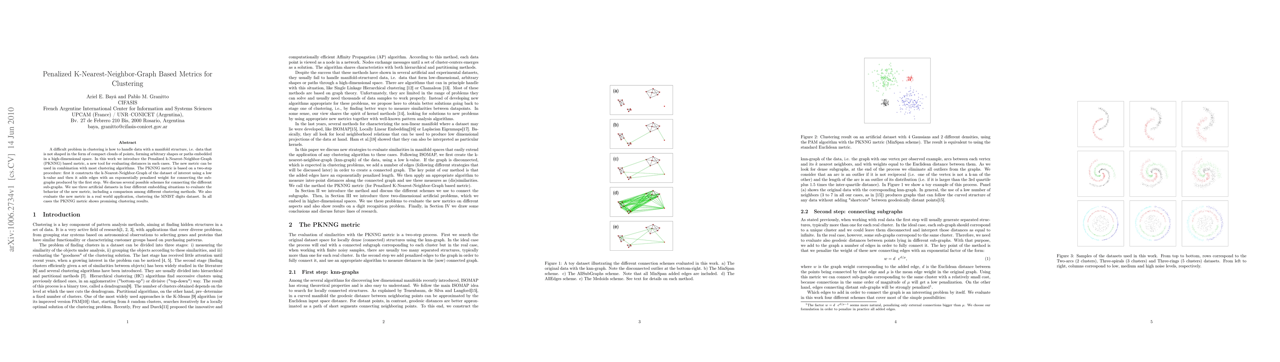 This paper introduces a Penalized k-Nearest-Neighbor-Graph (PKNNG) metric for clustering data with manifold structures, combining a k-NN graph construction with penalized weights to connect sub-graphs. The PKNNG metric shows promising results in both artificial and real-world datasets, including the MNIST digits dataset.
