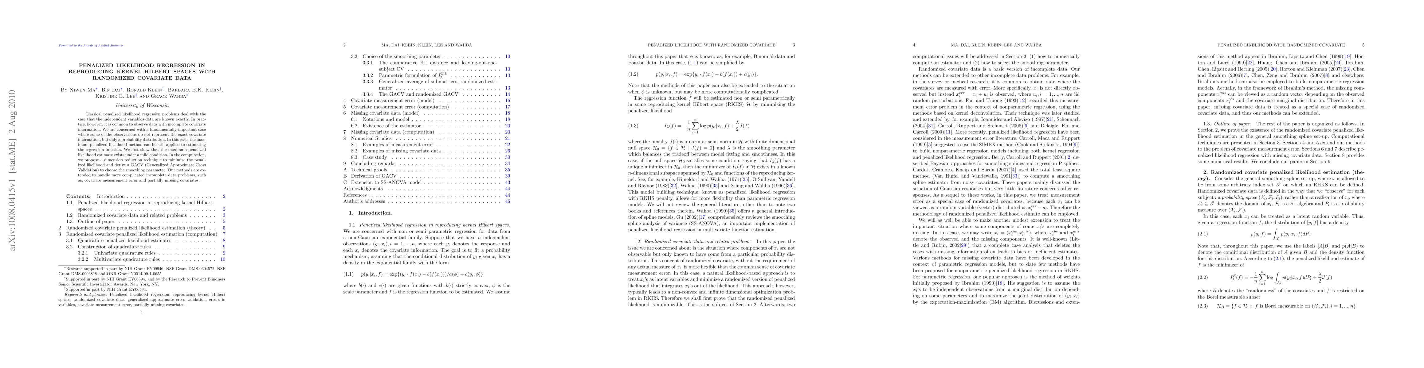 This paper explores penalized likelihood regression in reproducing kernel Hilbert spaces for data where exact covariate information is incomplete, proposing a method for estimating the regression function even when only probability distributions of covariates are available. It introduces a dimension reduction technique and a Generalized Approximate Cross Validation method for selecting the smoothing parameter.