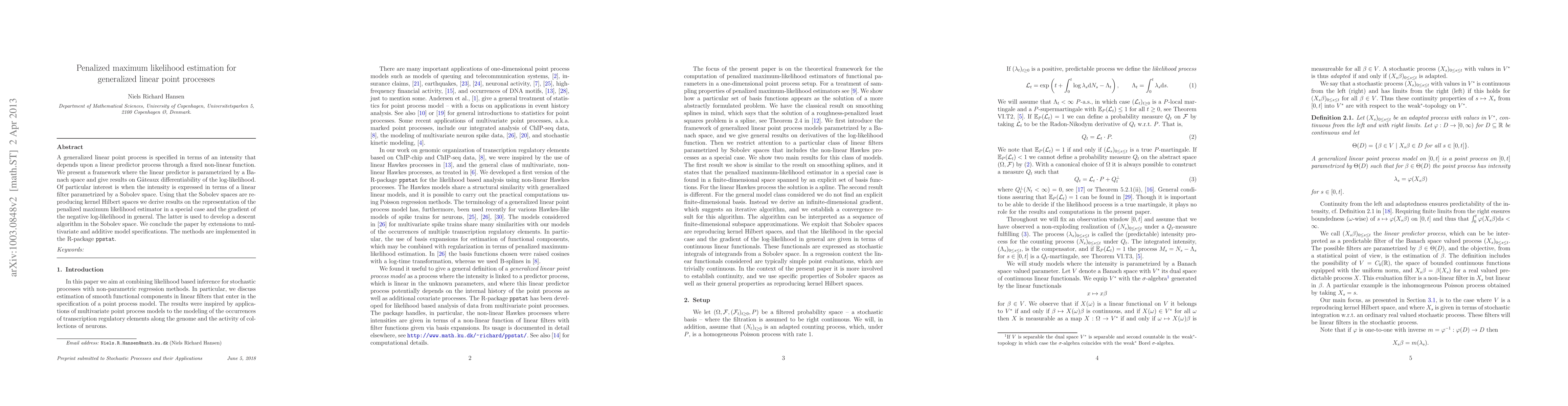 This paper develops a penalized maximum likelihood estimation framework for generalized linear point processes, focusing on the representation of the estimator in Sobolev spaces and deriving a gradient descent algorithm for optimization. The methods are implemented in the R-package ppstat and extended to multivariate and additive models.