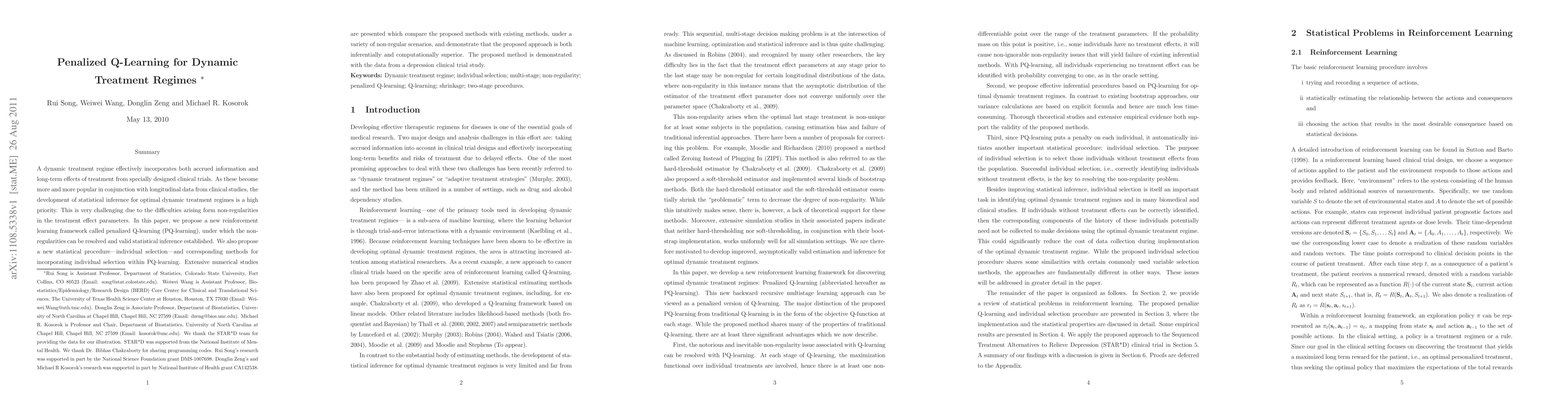A dynamic treatment regime effectively incorporates both accrued information and long-term effects of treatment from specially designed clinical trials. As these become more and more popular in conjunction with longitudinal data from clinical studies, the development of statistical inference for optimal dynamic treatment regimes is a high priority. This is very challenging due to the difficulties arising form non-regularities in the treatment effect parameters. In this paper, we propose a new reinforcement learning framework called penalized Q-learning (PQ-learning), under which the non-regularities can be resolved and valid statistical inference established. We also propose a new statistical procedure---individual selection---and corresponding methods for incorporating individual selection within PQ-learning. Extensive numerical studies are presented which compare the proposed methods with existing methods, under a variety of non-regular scenarios, and demonstrate that the proposed approach is both inferentially and computationally superior. The proposed method is demonstrated with the data from a depression clinical trial study.