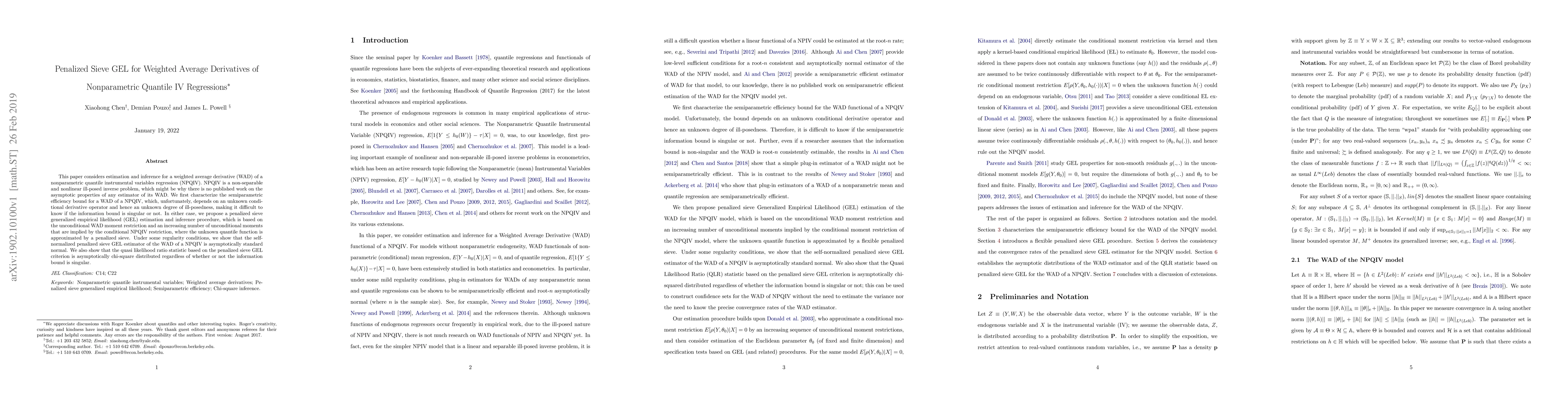 This paper considers estimation and inference for a weighted average derivative (WAD) of a nonparametric quantile instrumental variables regression (NPQIV). NPQIV is a non-separable and nonlinear ill-posed inverse problem, which might be why there is no published work on the asymptotic properties of any estimator of its WAD. We first characterize the semiparametric efficiency bound for a WAD of a NPQIV, which, unfortunately, depends on an unknown conditional derivative operator and hence an unknown degree of ill-posedness, making it difficult to know if the information bound is singular or not. In either case, we propose a penalized sieve generalized empirical likelihood (GEL) estimation and inference procedure, which is based on the unconditional WAD moment restriction and an increasing number of unconditional moments that are implied by the conditional NPQIV restriction, where the unknown quantile function is approximated by a penalized sieve. Under some regularity conditions, we show that the self-normalized penalized sieve GEL estimator of the WAD of a NPQIV is asymptotically standard normal. We also show that the quasi likelihood ratio statistic based on the penalized sieve GEL criterion is asymptotically chi-square distributed regardless of whether or not the information bound is singular.